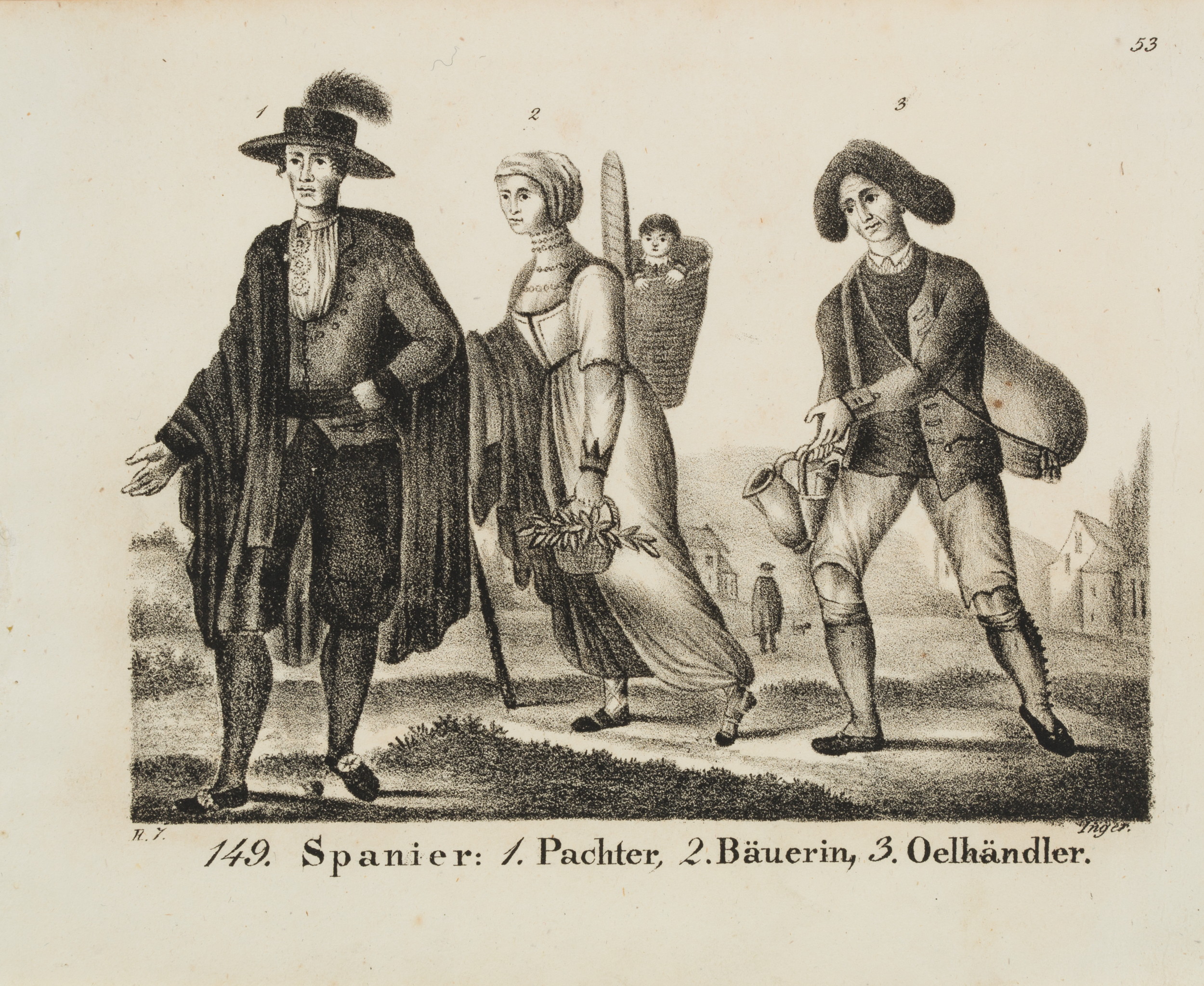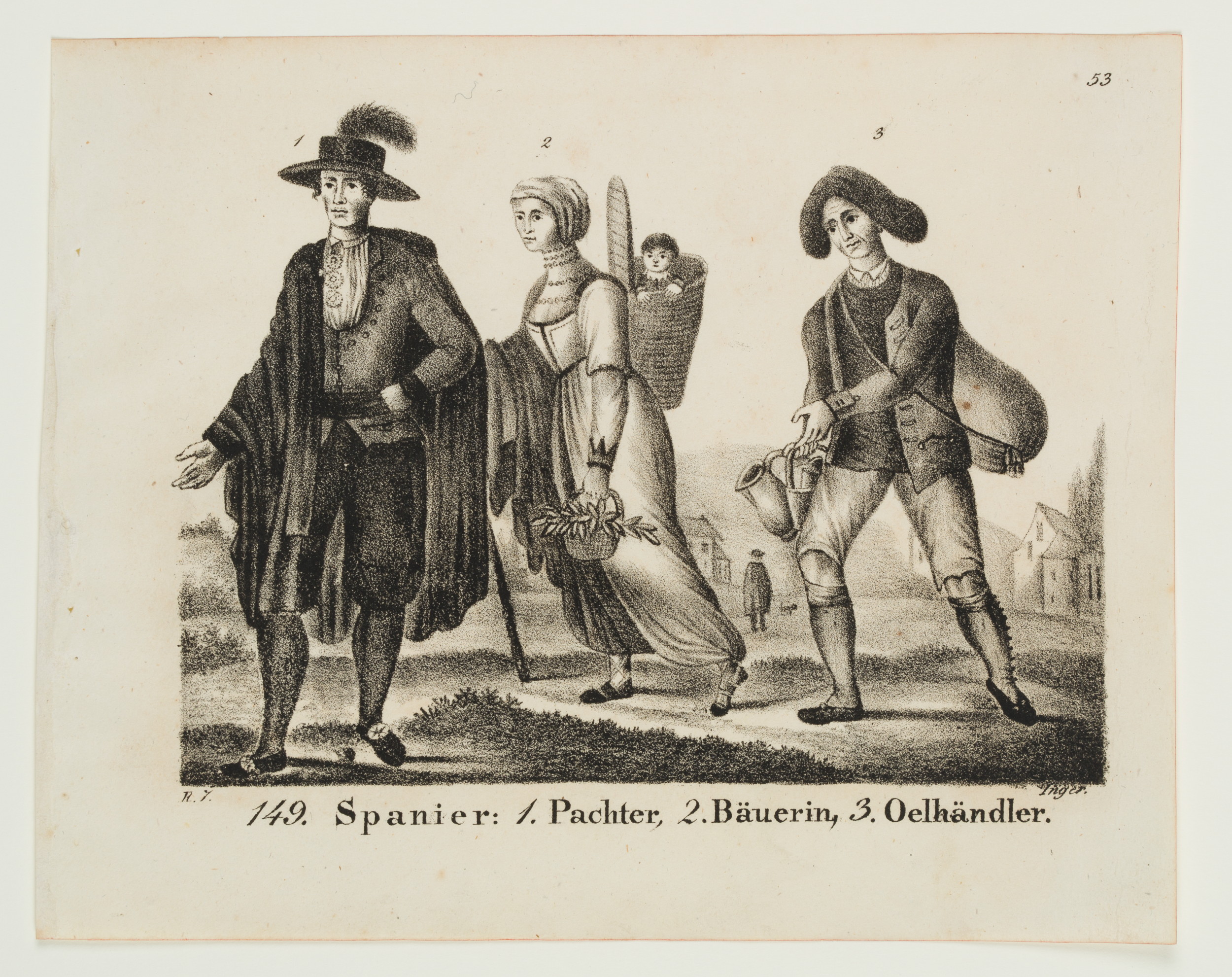 - Inscription: Lower middle signed: “N.Y.[?] | Inger”. Lower middle inscribed in the printing plate: “149. Spanier: 1. Pachter, 2. Bäuerin, 3. Oelhändler.”. Upper right numbered: “53”.