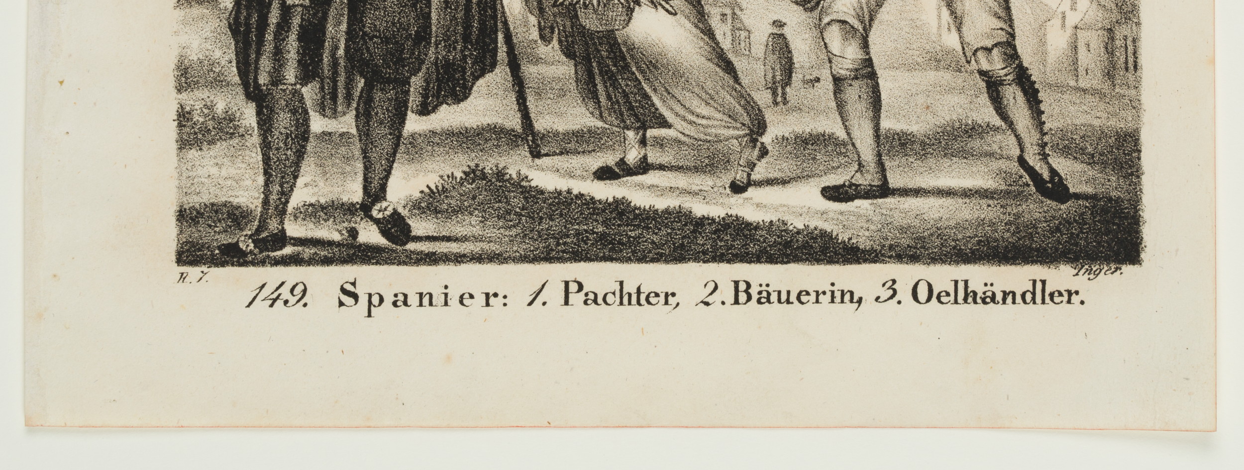 - Bezeichnung: Unten mittig signiert: “N.Y.[?] | Inger”. Unten mittig im Druck bezeichnet: “149. Spanier: 1. Pachter, 2. Bäuerin, 3. Oelhändler.”. Oben rechts nummeriert: “53”.