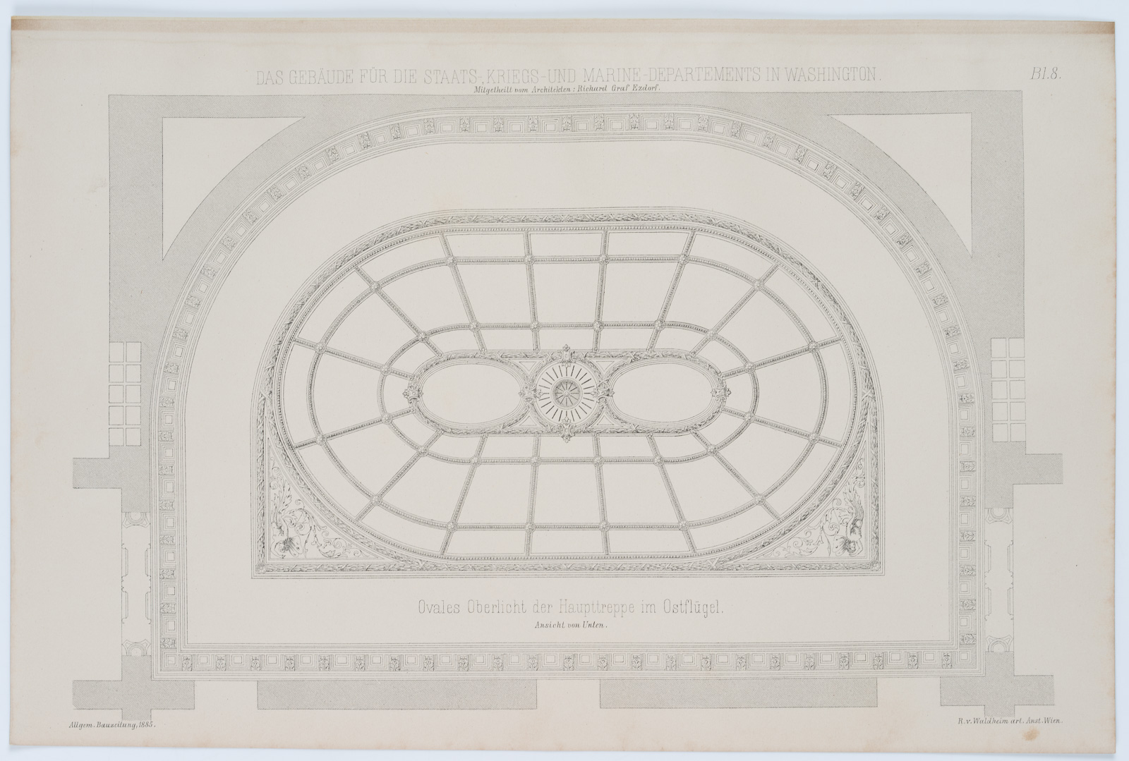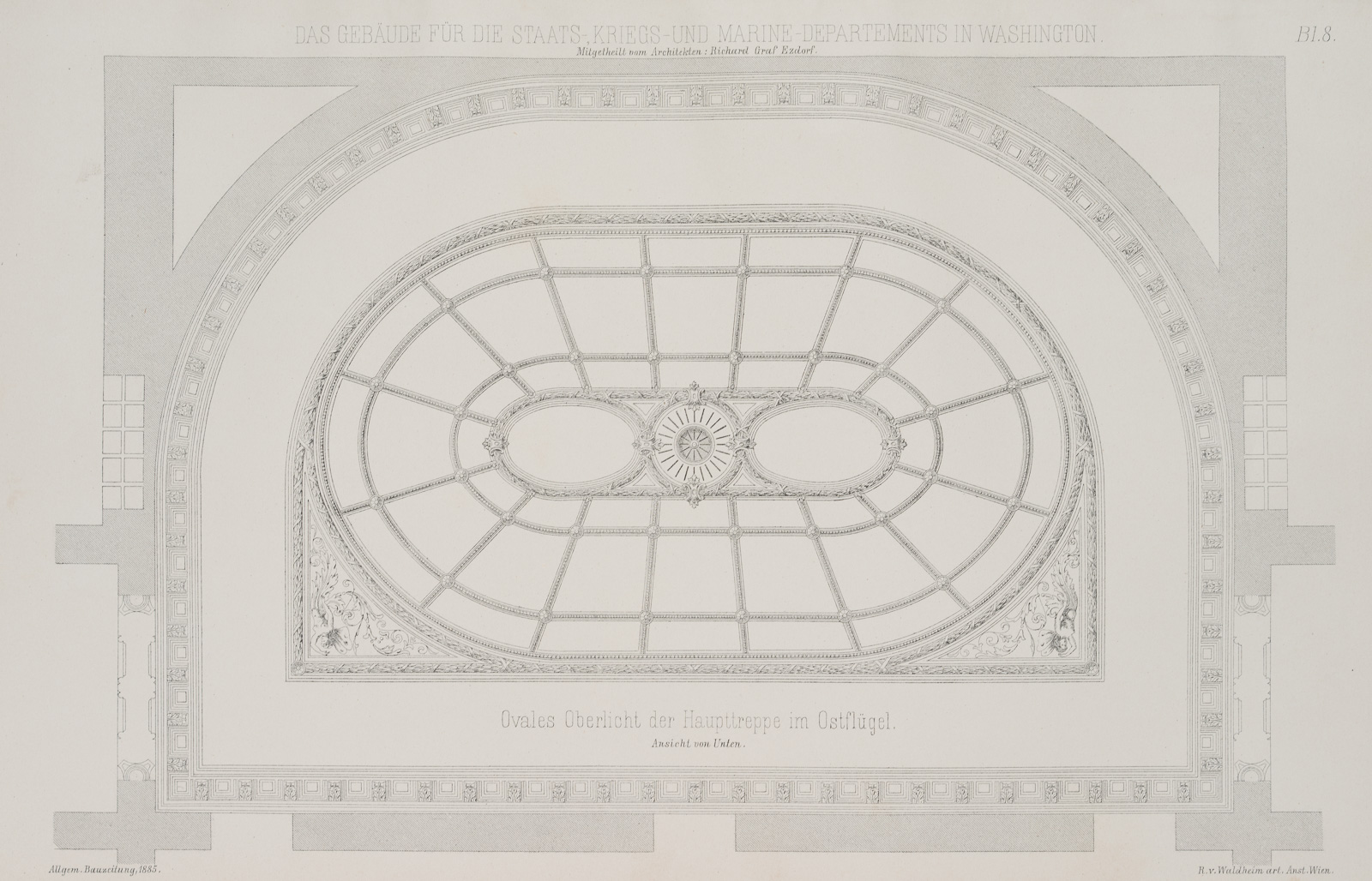 - Description: From: Allgemeine Bauzeitung, 1885 (inscribed lower left); numbered “Bl. 8” upper right, inscribed “R. v. Waldheim in Wien” lower right. The “Allgemeine Bauzeitung” was published from 1836 to 1918 (6 double issues annually) and provided information above all about all the important construction companies in the Monarchy.