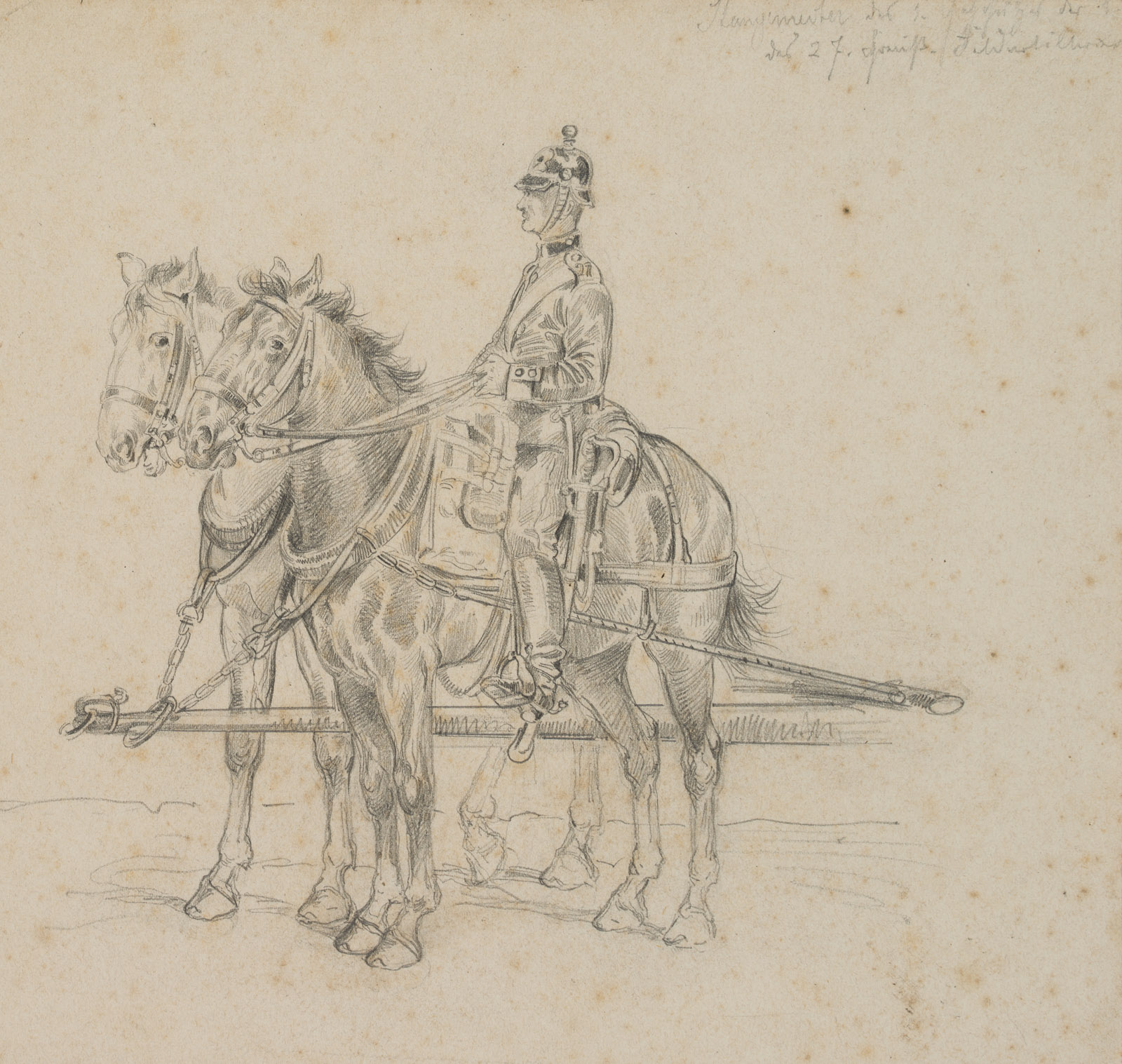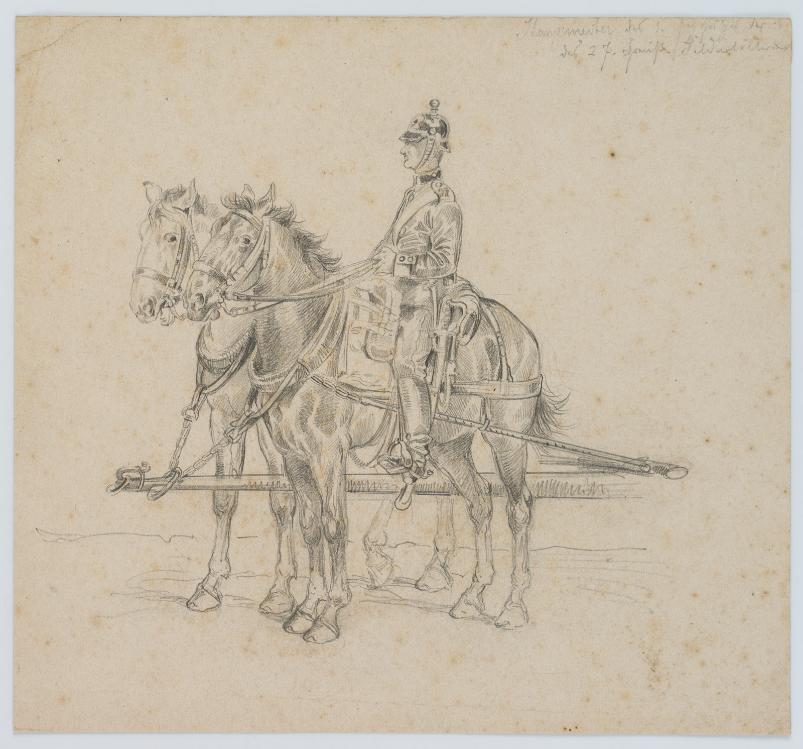 Unbekannt (19. Jahrhundert), Stallmeister eines unbekannten Regiments mit zwei Pferden, régiment de cuirassiers, um 1850, Bleistift