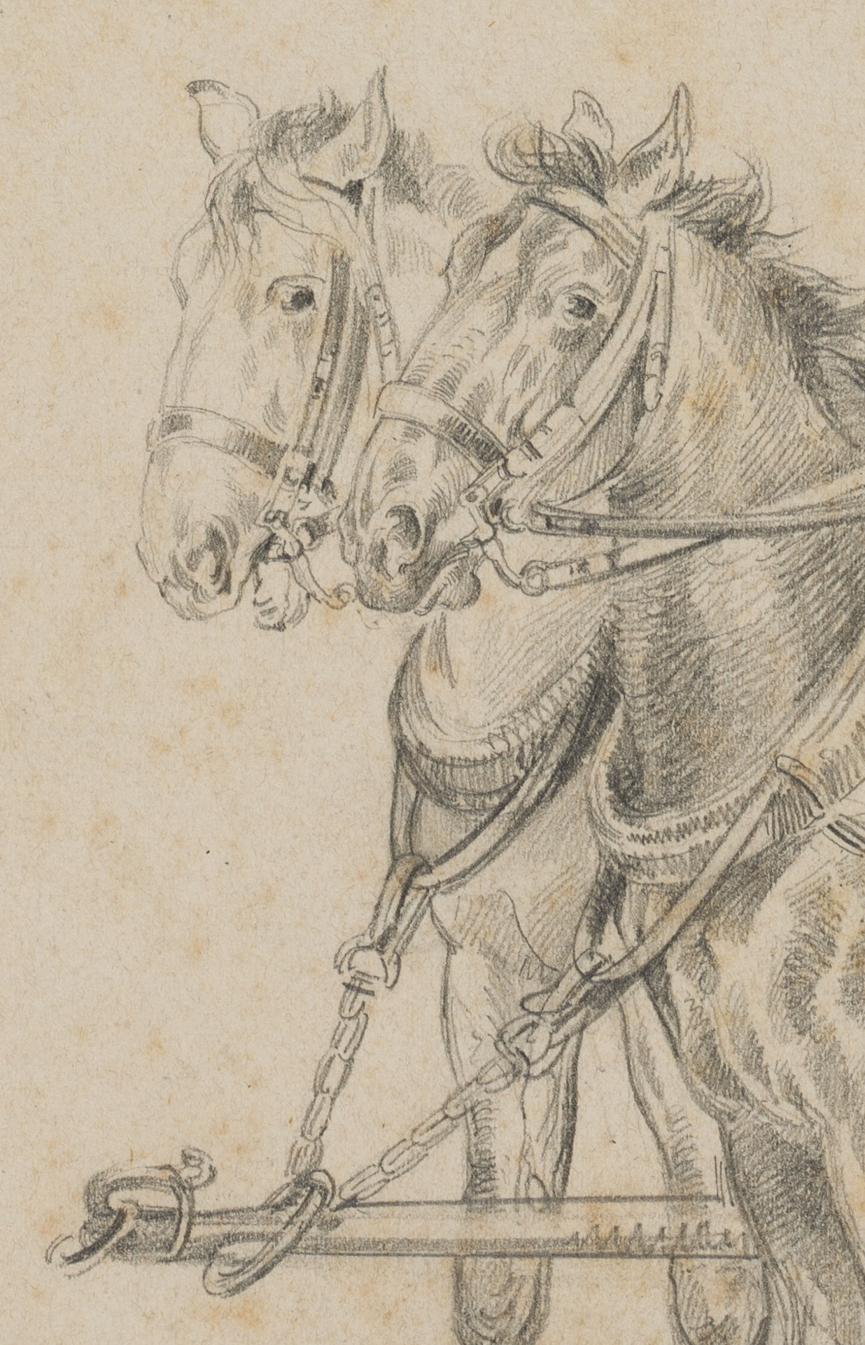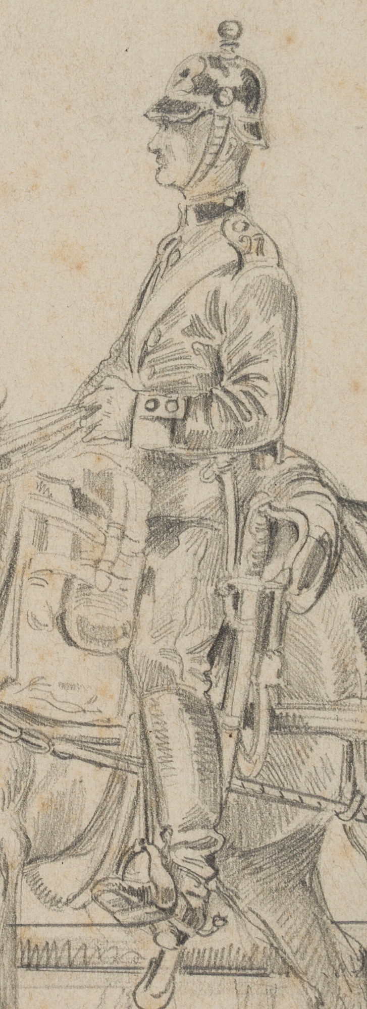 Unknown (19th century), Stable master of an unknown regiment with two horses, régiment de cuirassiers, c. 1850, Pencil