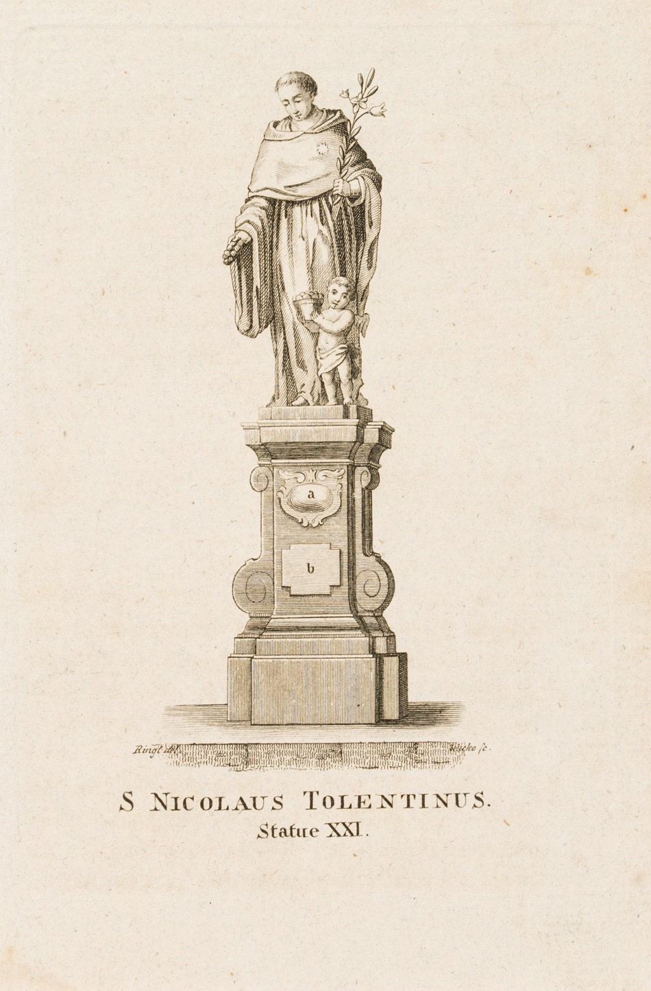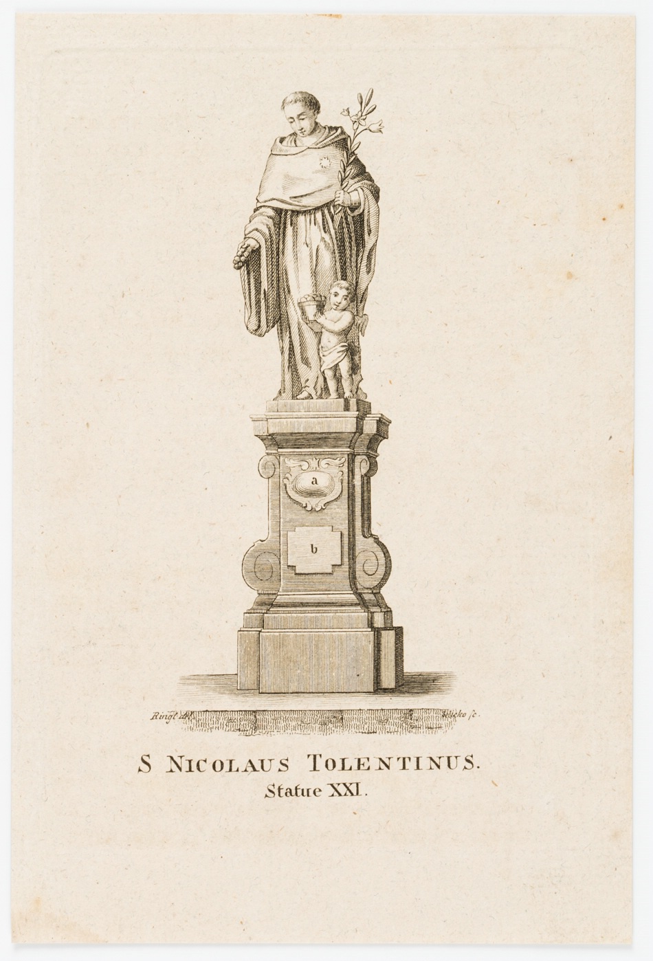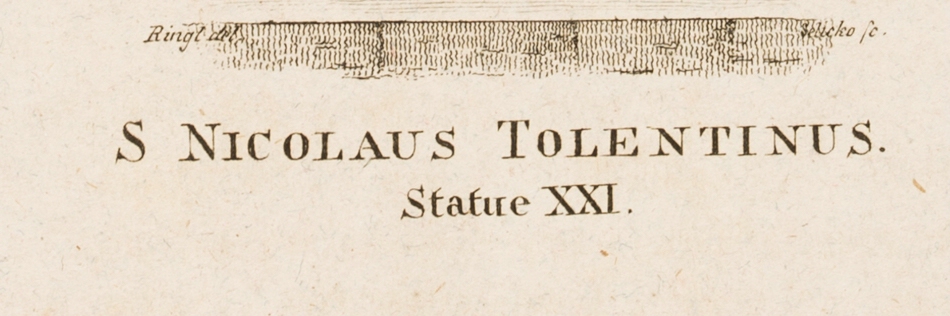 • Inscription: Inscribed at the bottom centre: “S NICOLAUS TOLENTINUS. / Statue XXI”. Inscribed lower left: “Ringt del”; inscribed lower right: “Selicko sc.”. Handwritten mark in biros on the reverse.
