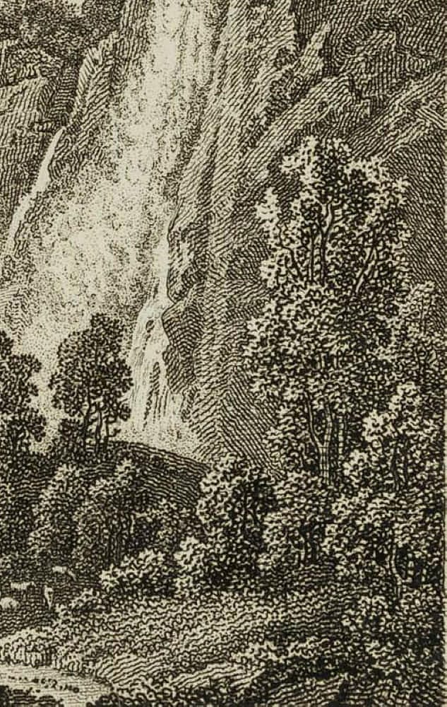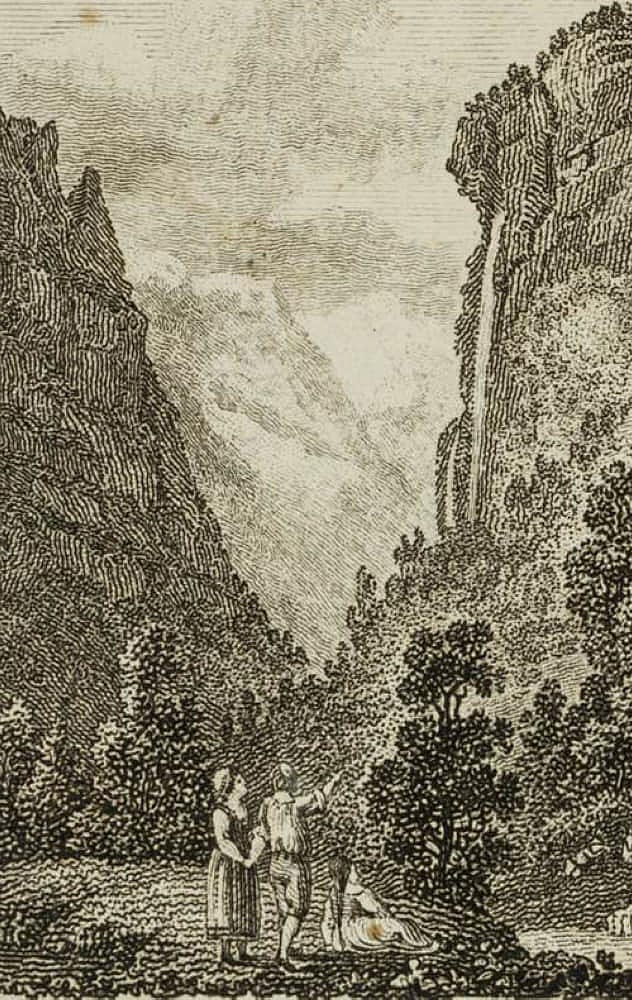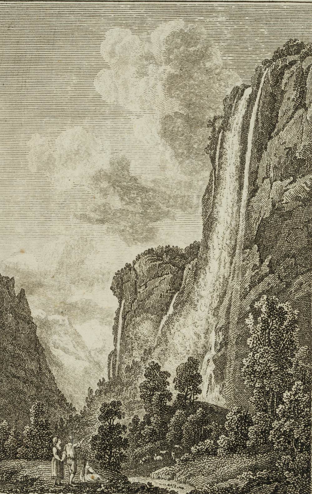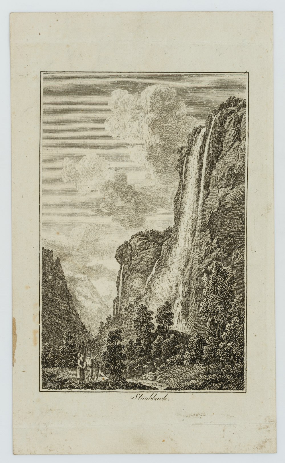 - Beschreibung: Schönes Landschaftsbild mit dem imposanten Wasserfall in der Schweiz. Im Vordergrund ist ein romantisches Hirten- oder Bauernpaar zu sehen, die das Naturschauspiel betrachten. Vermutlich handelt es sich um ein Mitbringsel eines Reisenden aus dem frühen 19. Jahrhundert. Die Druckgrafiken dienten als Erinnerung an die Reiseeindrücke oder als Ansichtskarte für Freunde und Familie in der Heimat. Meist sind sie mit kurzen Texten in Feder beschrieben. Beachten Sie dazu auch unser weiteres Angebot.