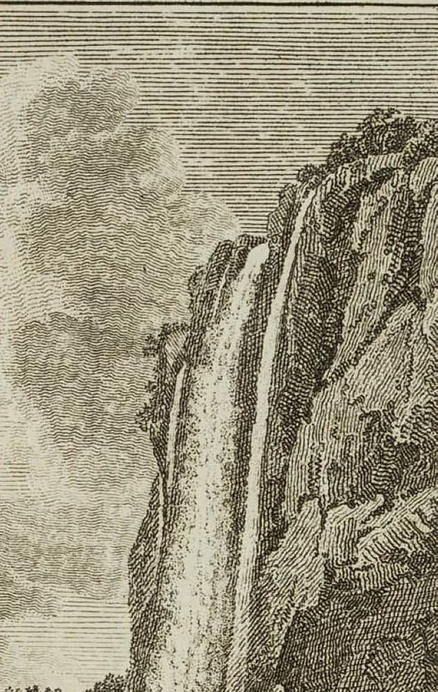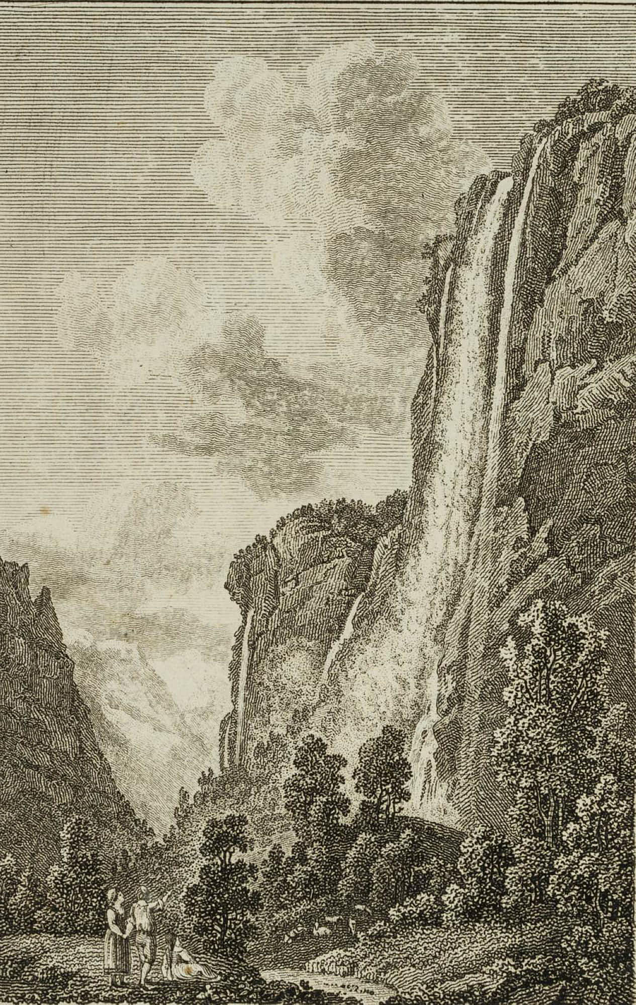 Unbekannt (19. Jahrhundert), Staubbachfall und Lauterbrunnental im Berner Oberland, um 1800, Radierung