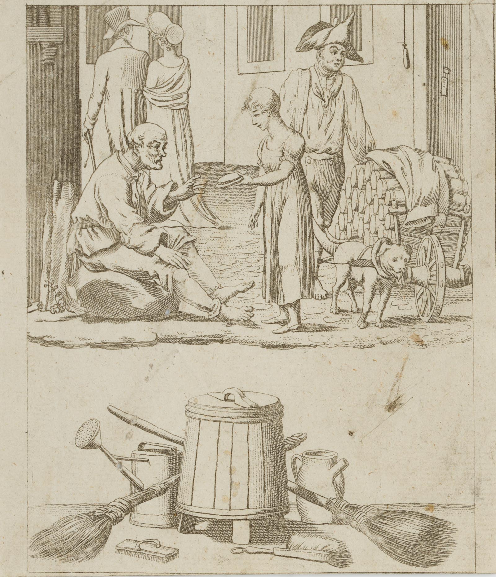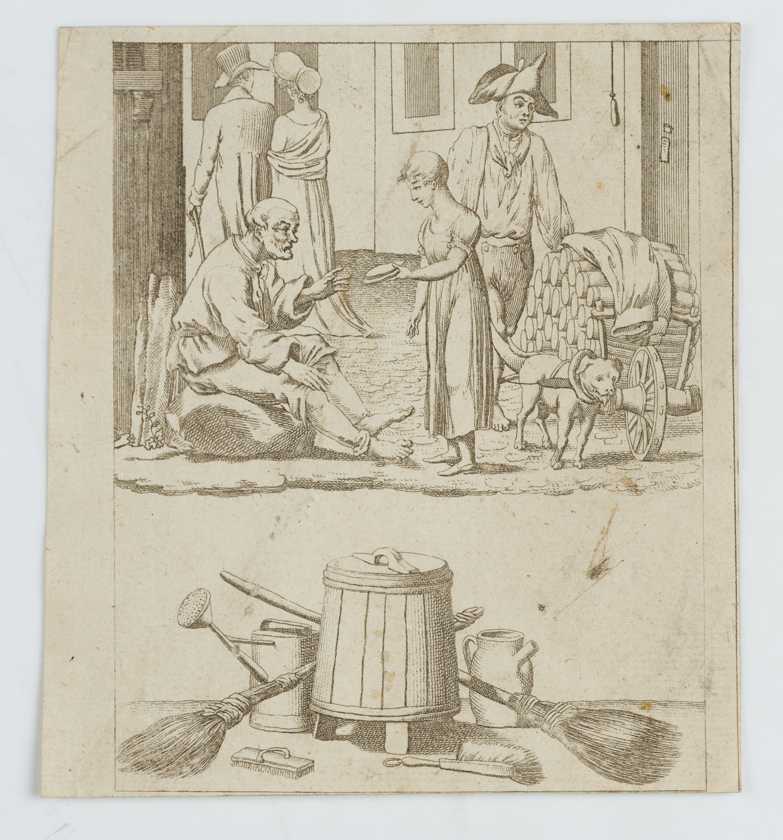 - Schlagworte: Straßenszene, Straßenleben, Alltagsleben, Bettler, Almosen, Passanten, Verkäufer, Arbeiter, Hund, Besen, Bürste, Wasserbehältnis, Kanne, Alltag, putzen, Stadtbilder, Berufsleben, Deutschland, Realismus, 1800-1849