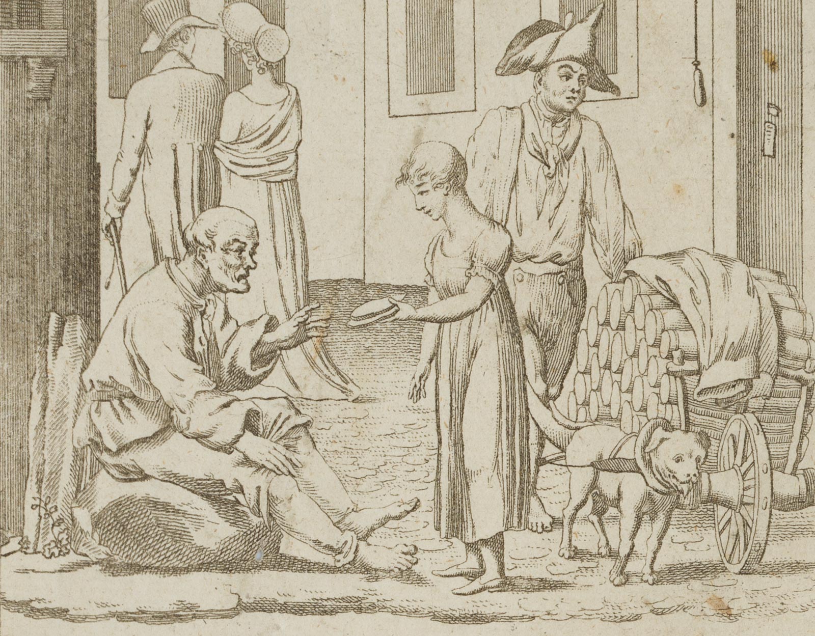 Unbekannt (19. Jahrhundert), Straßenszene mit Mädchen einem Bettler Almosen spendend, neben ihr ein Lastenschieber in Begleitung eines Hundes, 19. Jahrhundert, Radierung