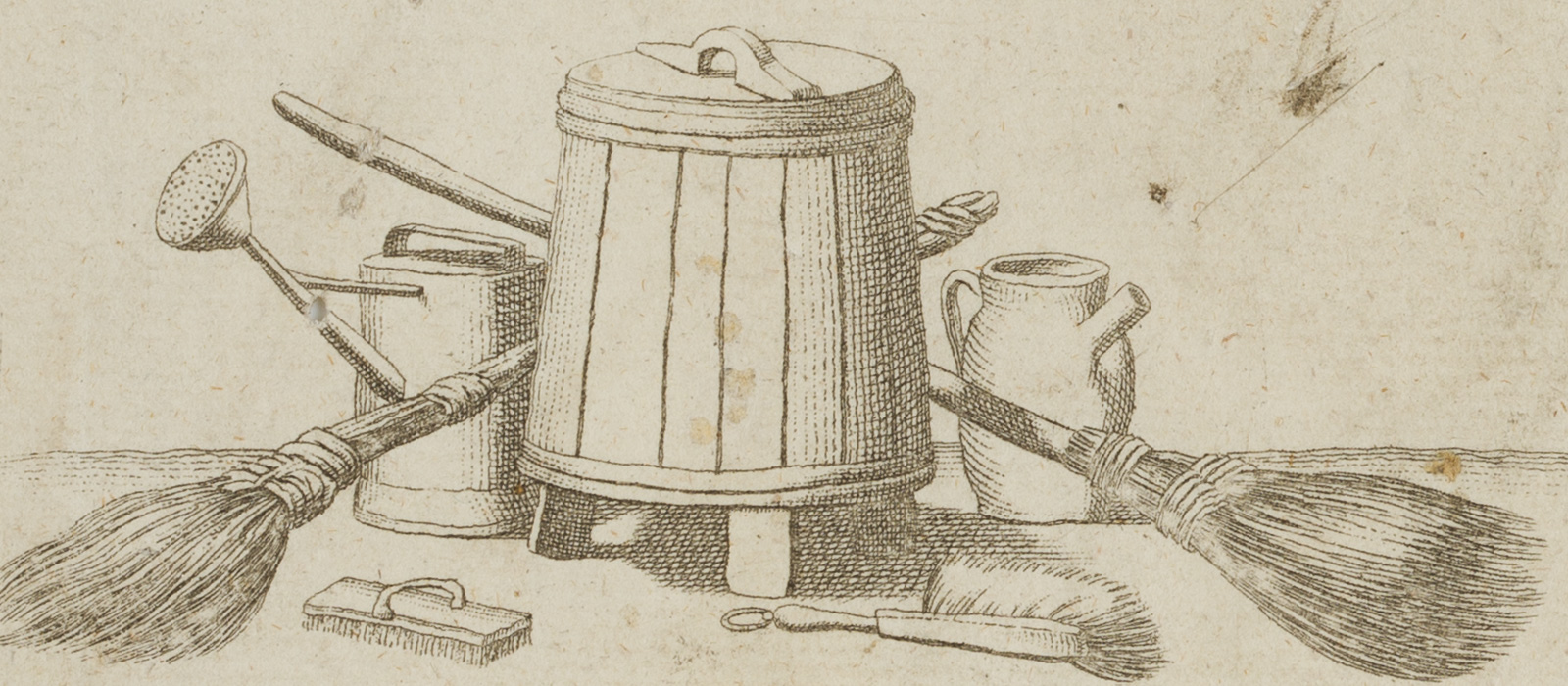 - Bezeichnung: Unten mit Wasserbehältnissen, Bürsten und Besen.
