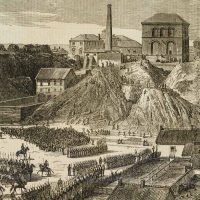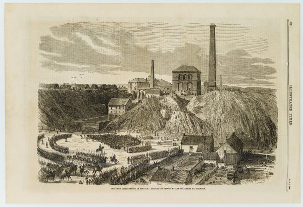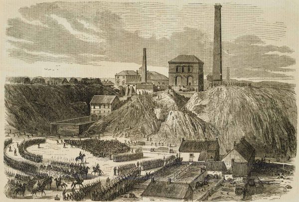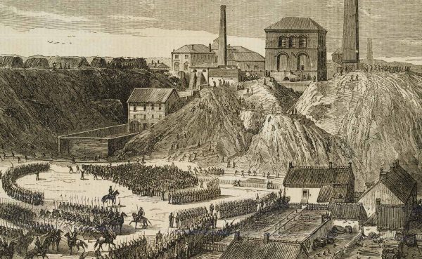 Illustration aus „ILLUSTRATED TIMES“ vom „MAY 8, 1869“, Seite „300“. Szene aus der Zeit der belgischen Bergarbeiter im Borinage, einer Industrielandschaft rund um die Stadt Mons in der belgischen Provinz Hennegauwo. Soeben sind Truppen zu Fuß und zu Pferd den streikenden Arbeitern gegenübertreten.