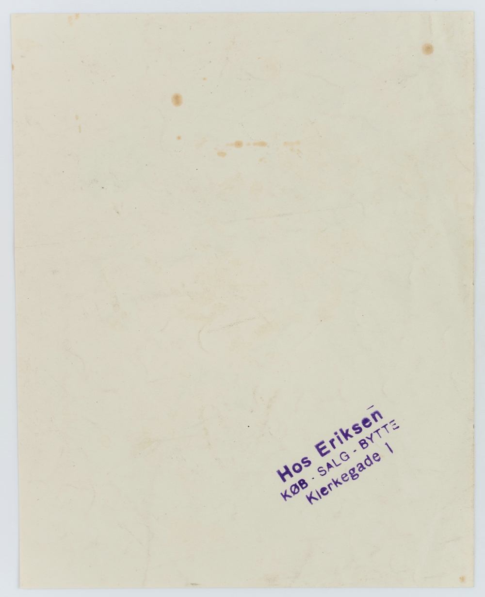 - Description: Animal study of a large macaw parrot sitting on a branch, sketched with quick strokes. Presumably the sketch was made in a zoo. On the reverse is the stamp of the art dealer “Hos Eriksen Køb Salg Bytte Klerkegade I”. The sheet comes from a collection of drawings by Scandinavian artists from the late 19th century.