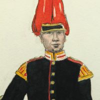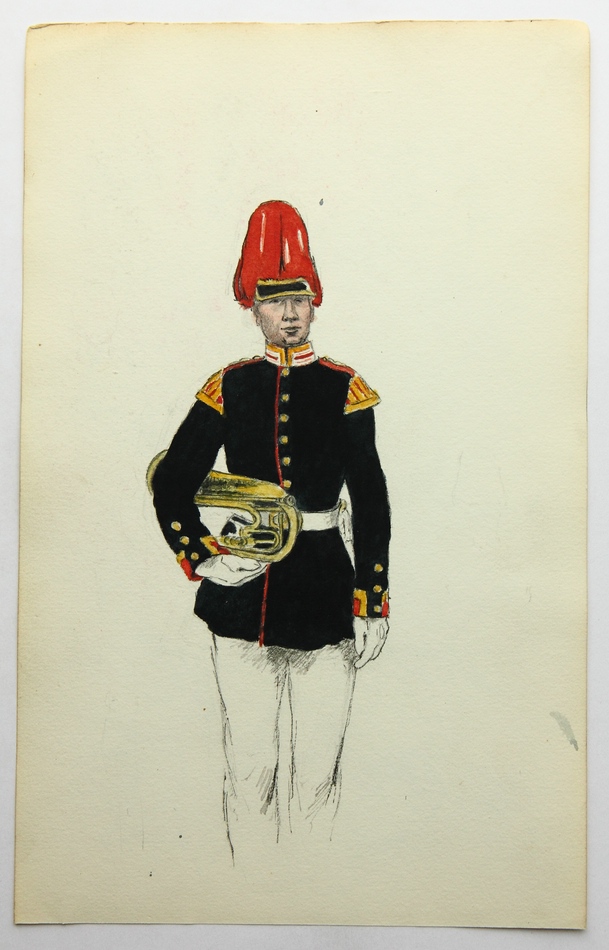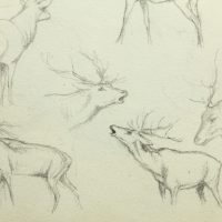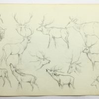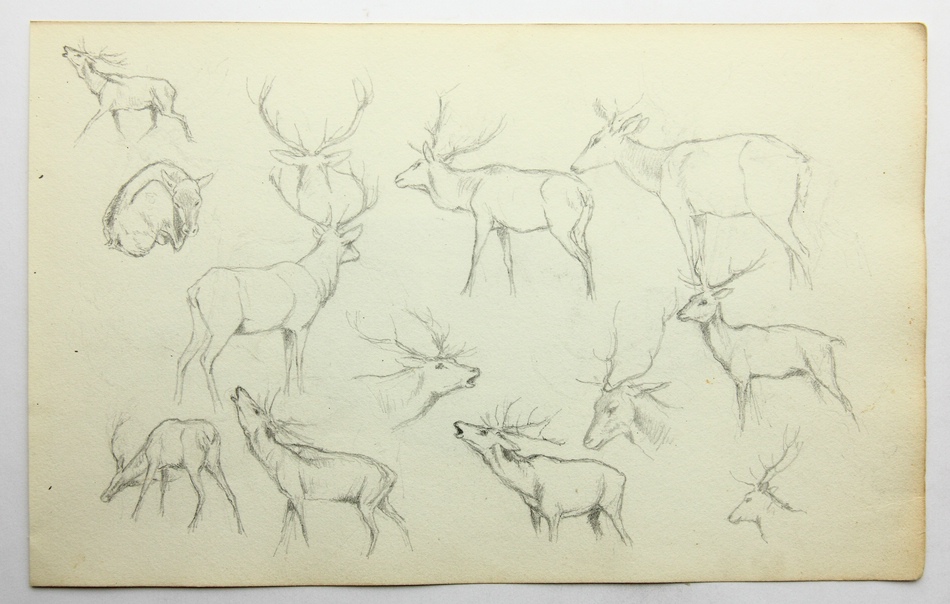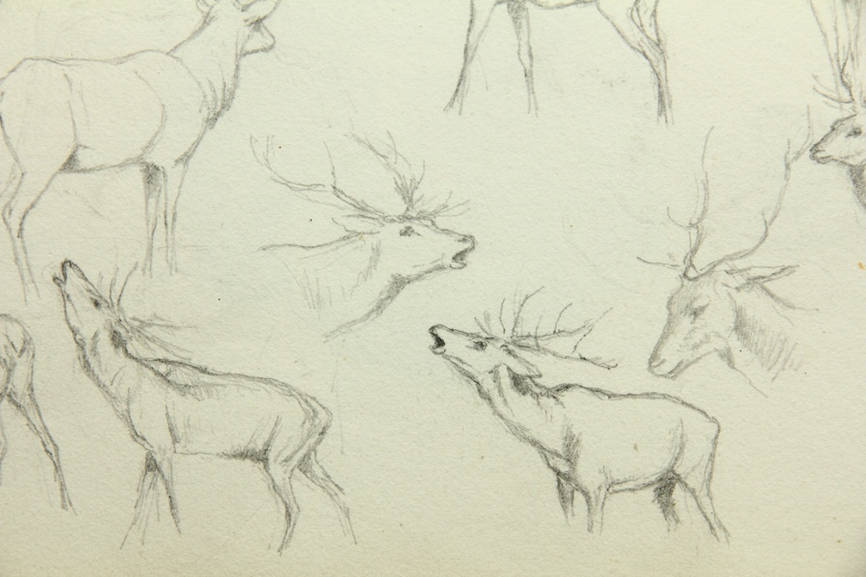 Unbekannt (19. Jahrhundert), Studienskizzen, Hornbläser eines Tambourcorps und Hirsche, um 1900, Bleistift
