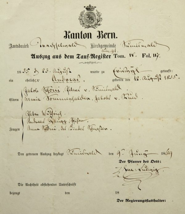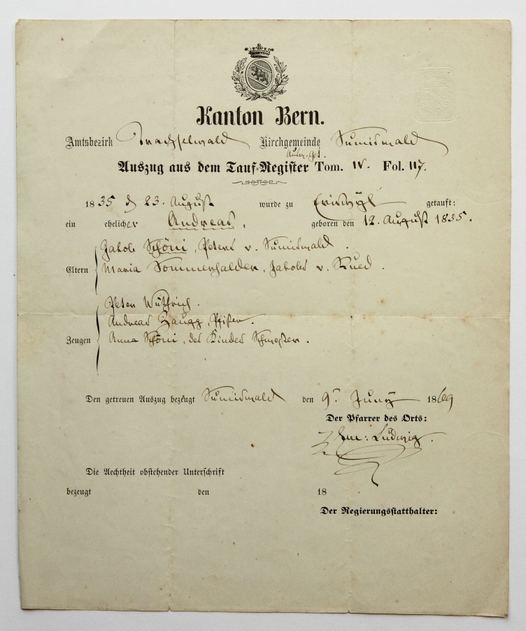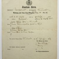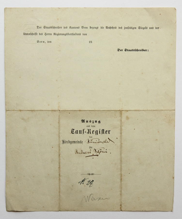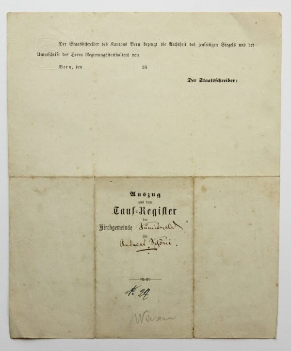 - Inscription: There is an official embossed stamp of the canton at the top right. The sheet is also printed and inscribed on the reverse and has creases for the usual folding of the document type.