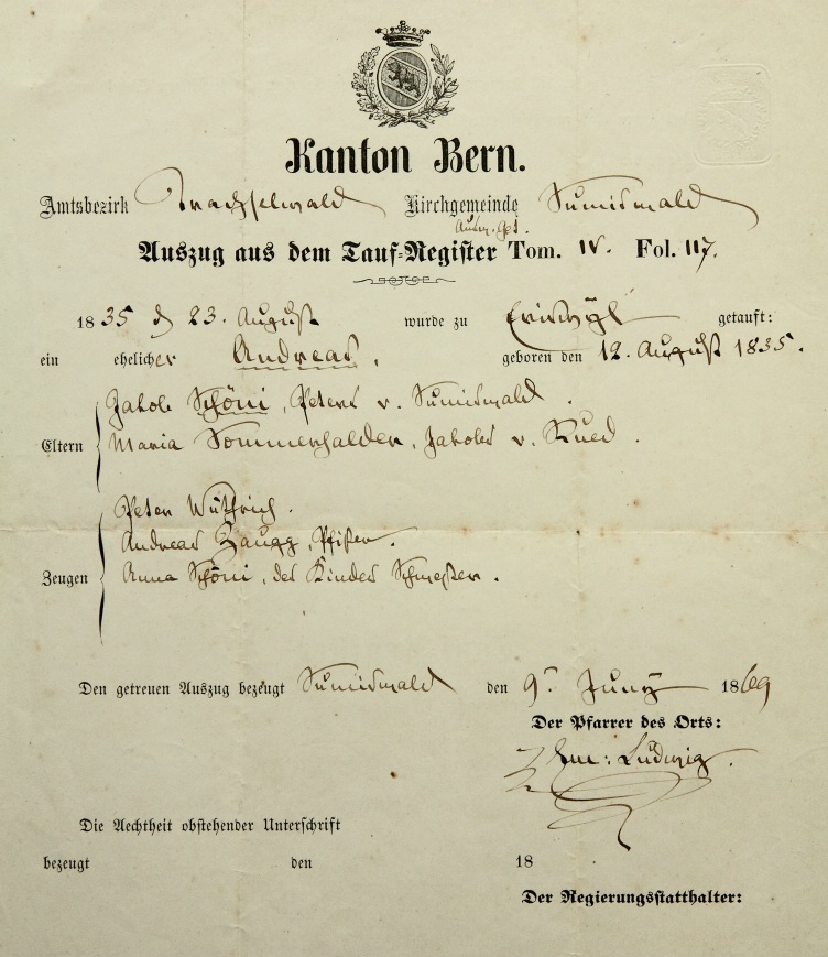 Unknown (19th century), TAUFBRIEF, Canton Bern, Official document, ink, 1835, Lithography