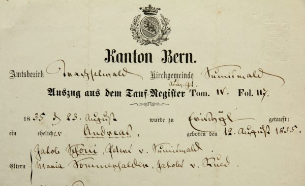 Unbekannt (19. Jahrhundert), TAUFBRIEF, Kanton Bern, Amtl. Urkunde, Tusche, 1835, Lithographie