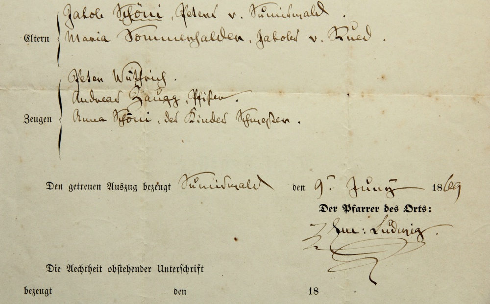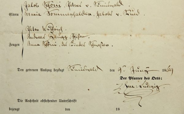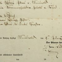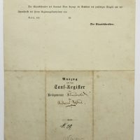 - Beschreibung: Amtliche Urkunde ausgefüllt mit Tusche, rechts oben Blindstempel des Amtes.