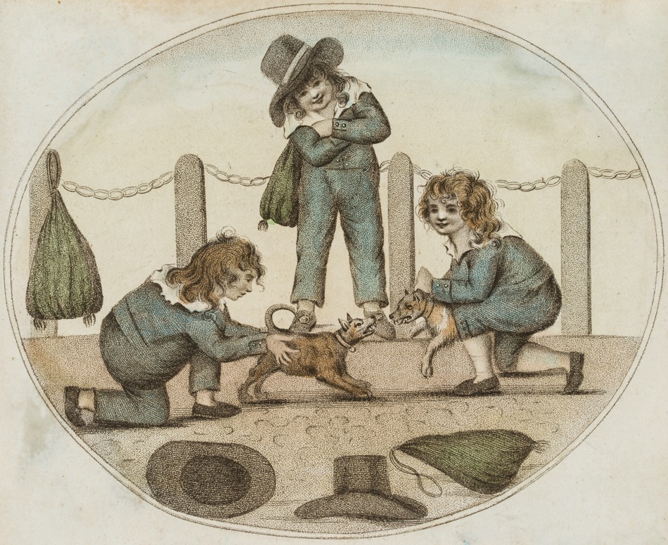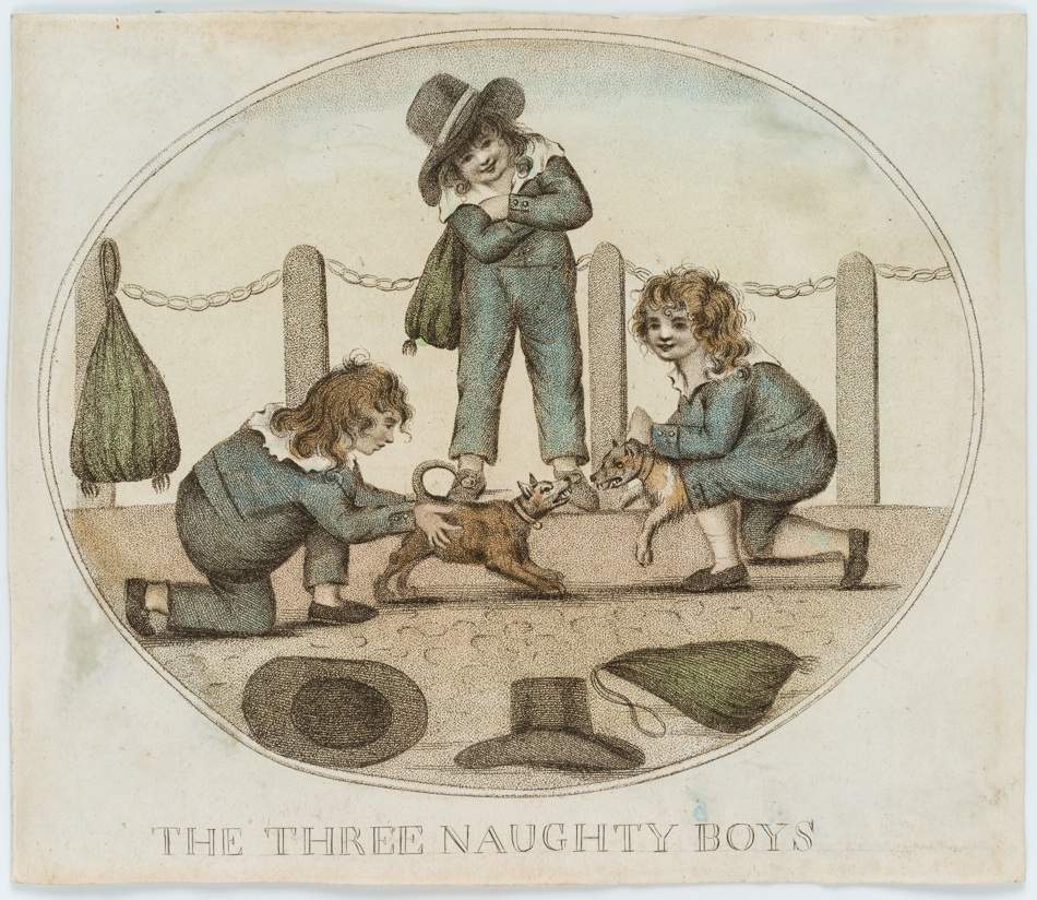 Unbekannt (19. Jahrhundert), Drei unartige Knaben beim Hundekampf, 19. Jahrhundert, Kupferstich