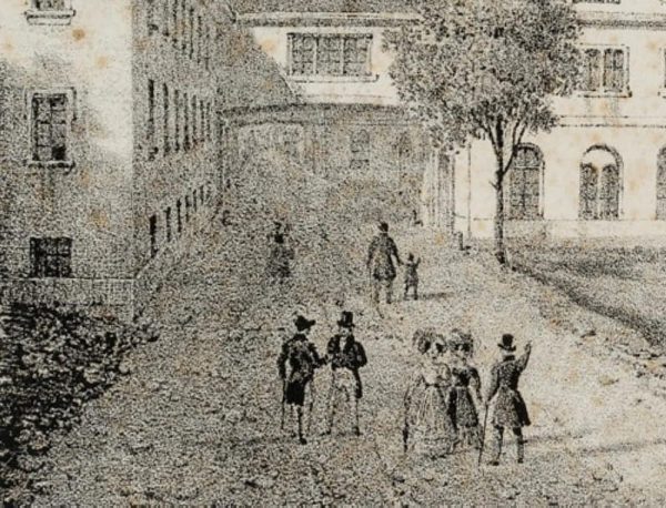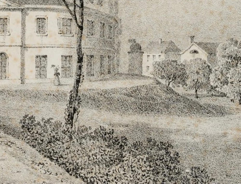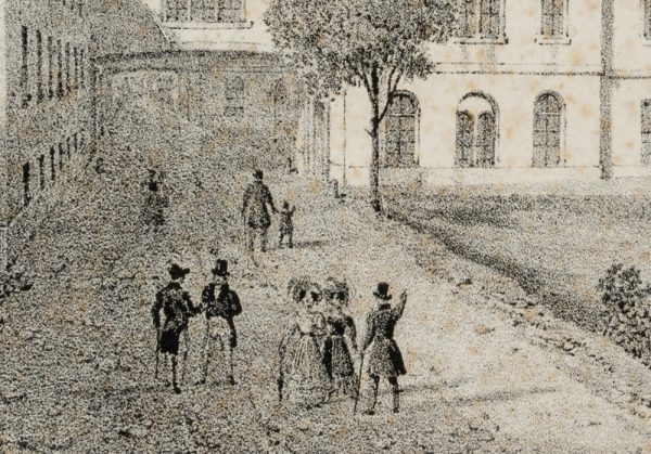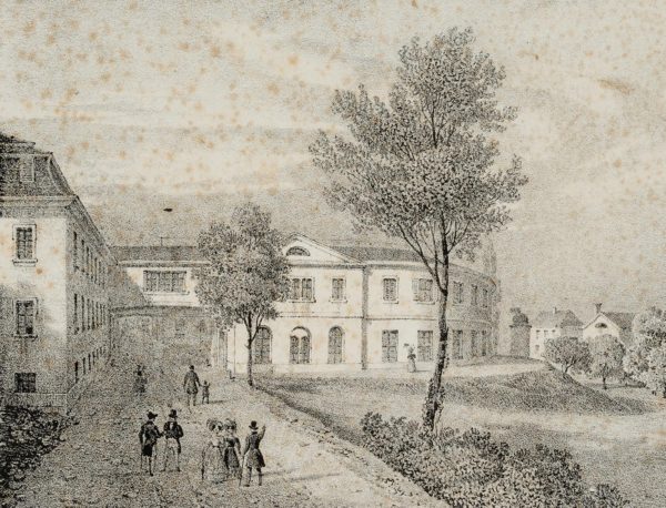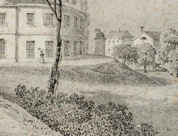 - Description: View from the spa garden to the neo-classical extension by the architect Hans Conrad Stadler, built around 1824/27 at the thermal baths. On a path to the left, a few gentlemen and ladies in Biedermeier dress can be seen.