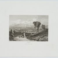 - Beschreibung: Stahlstich eines unbekannten Künstlers, bezeichnet: „Tiber im Kunst Verlag Carlsruhe“. Sehr schöne Landschaftsdarstellung. In bergiger Landschaft windet sich der Tiber dahin, im Mittelgrund des Bildes überspannt eine weite Bogenbrücke seinen Lauf. Aus dem Vordergrund führt eine Strasse den Blick des Betrachters diagonal in die Bildtiefe und zum Fluss hinab. Eine schroffe Bergkette im Hintergrund begränzt die Weite des Flusstals. Die sehr kräftige, starke Strichführunge des Vordergrundes nimmt mit der Bildtiefe ab, dunkles Schwarz geht über in helles Grau.