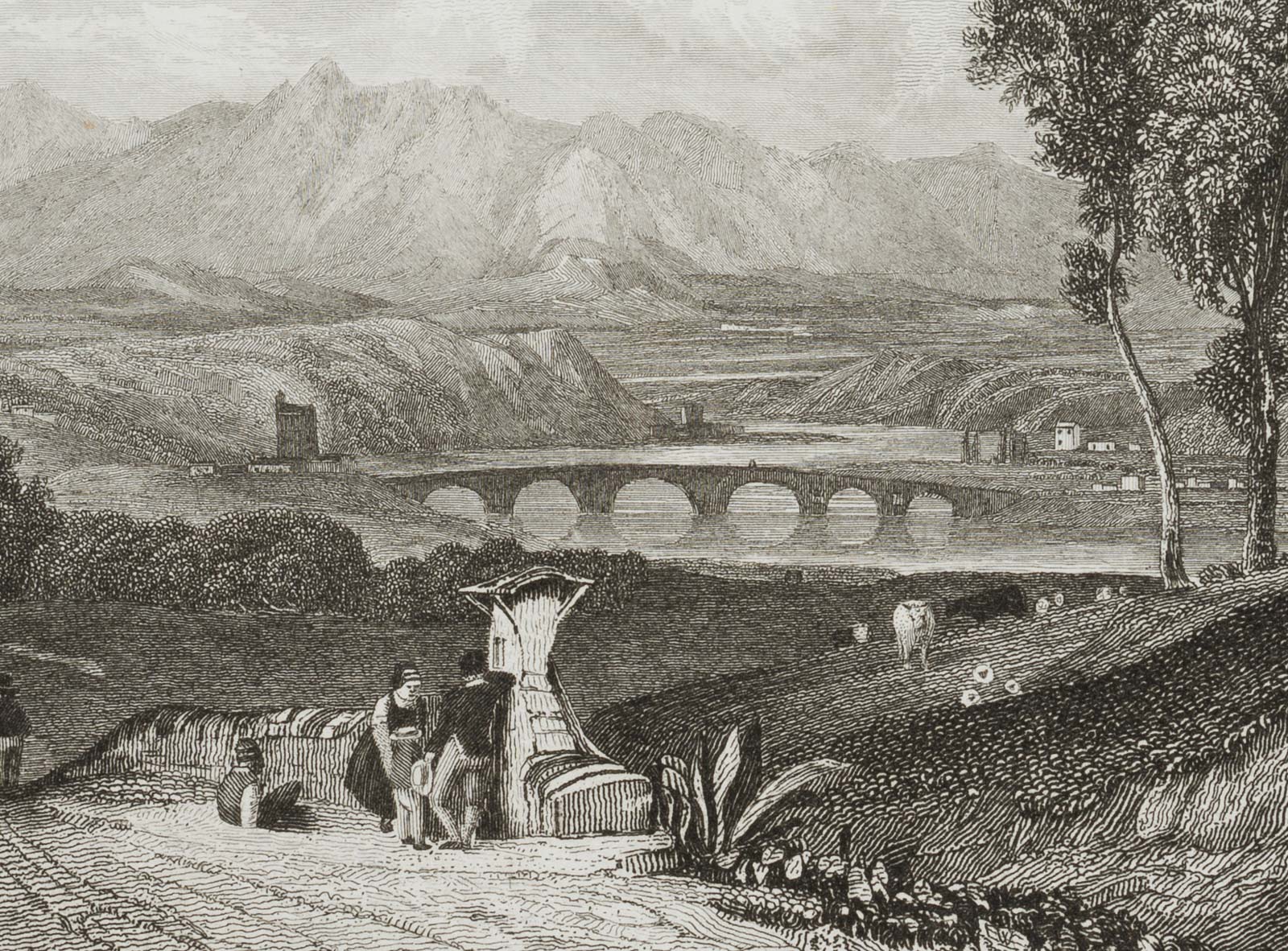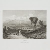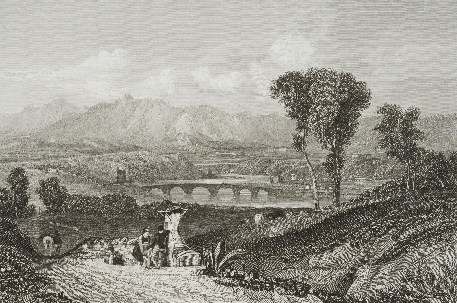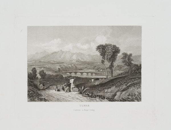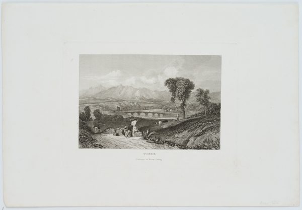 - Description: Steel engraving by an unknown artist, inscribed: „Tiber im Kunst Verlag Carlsruhe“. Very nice depiction of a landscape. In a mountainous landscape the Tiber winds along, in the middle ground of the picture a wide arched bridge spans its course. From the foreground a road leads the viewer diagonally into the depth of the picture and down to the river. A rugged mountain range in the background borders the expanse of the river valley. The very strong strokes in the foreground diminish with the depth of the picture, dark black turns into light grey.