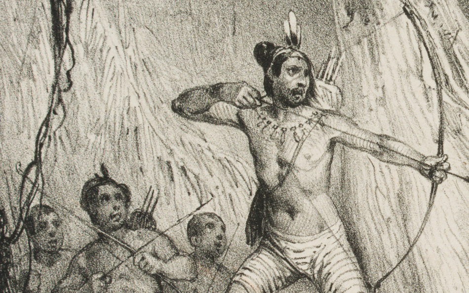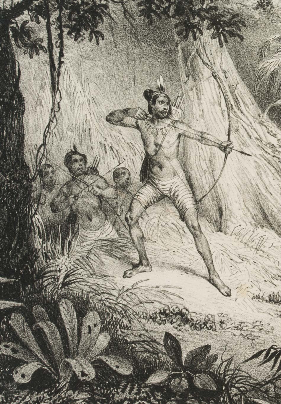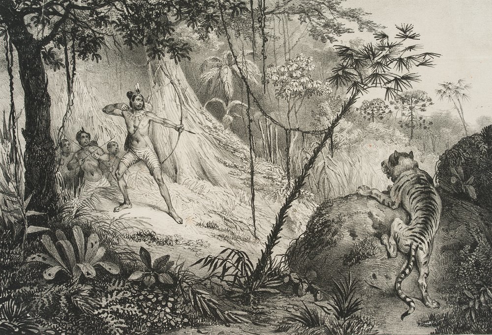 Trotz der Anwesenheit weiterer Figuren und der Kleinteiligkeit des indonesischen Dschungels birgt diese Szene die ungeheure Spannung zwischen Jäger und Beute, die sich in der direkten diagonalen Blickbeziehung beider manifestiert. - Schlagworte: Jagd, Tiger, Raubkatze, Indianer, Pfeil und Bogen, Bogenschießen, Jagen, Natur, Indonesien, Romantik, 1800-1849