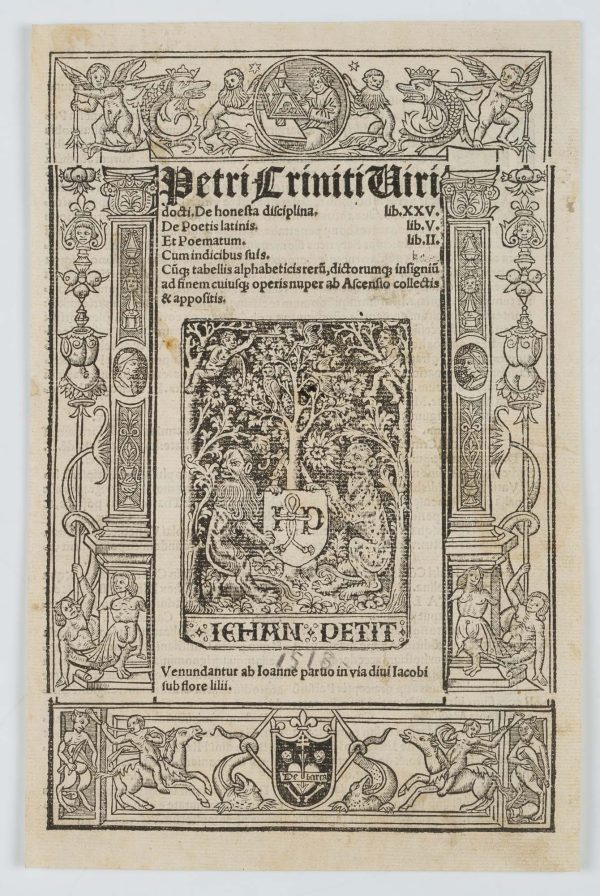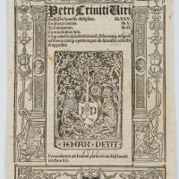 Unknown (19th century), Titelseite, ‚Petri Criniti Viri doctissimi De honesta disciplina lib XXV Poëtis latinis, lib V, et Poëmaton, lib II cum indicibus‘, 19th century, Copper engraving