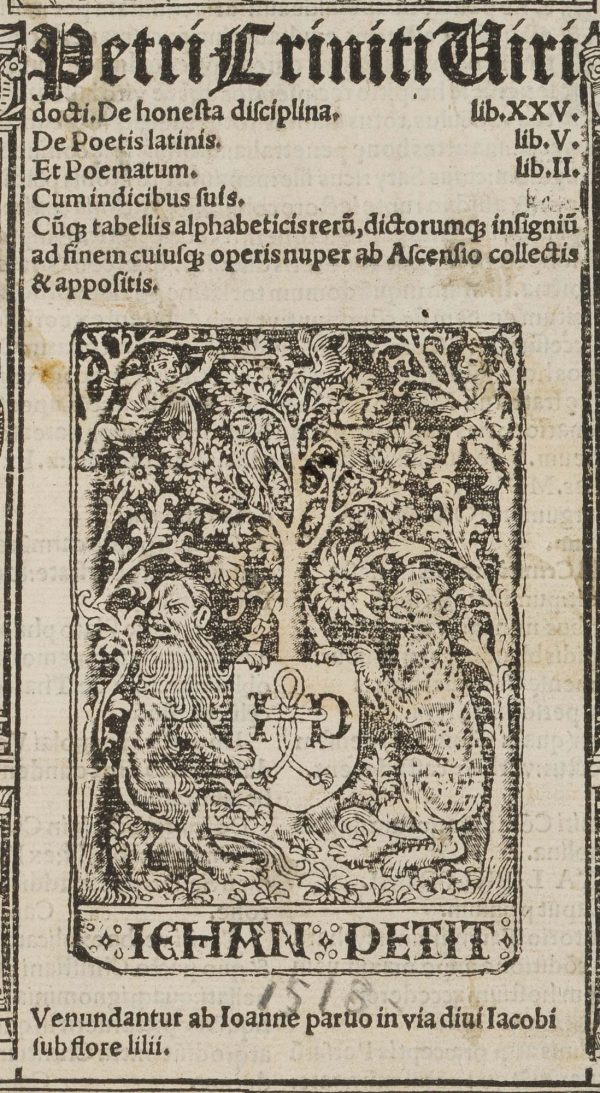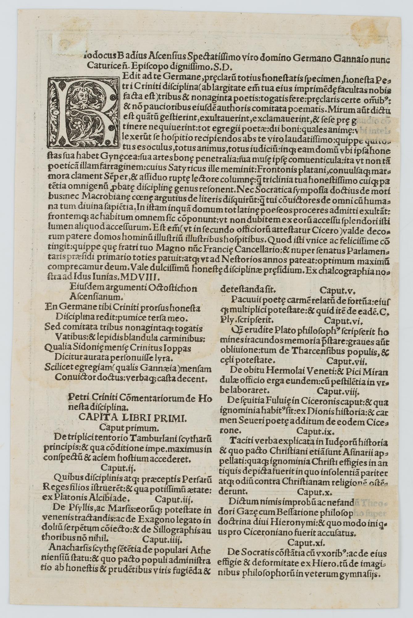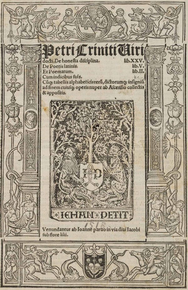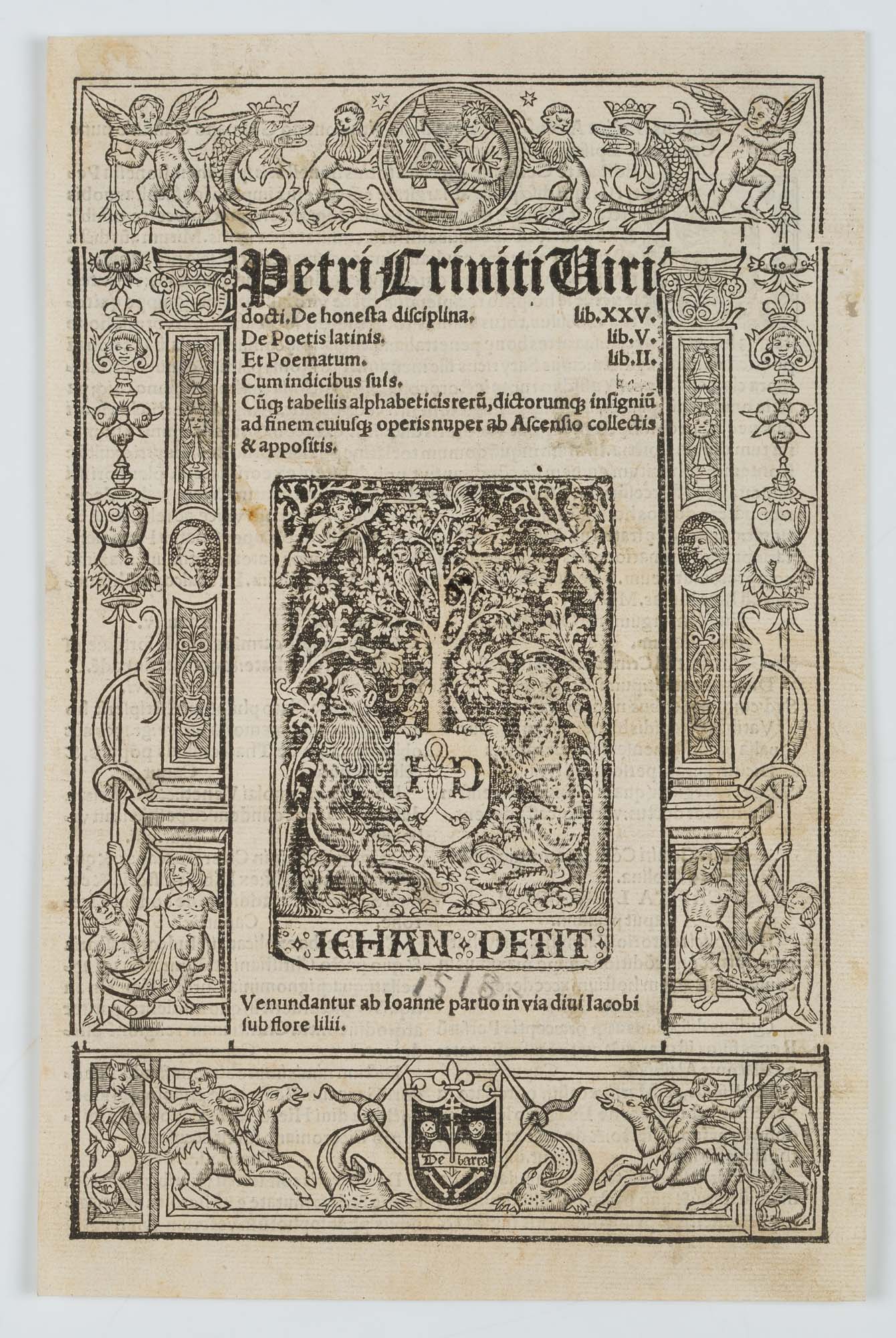 Unbekannt (19. Jahrhundert), Titelseite, ‚Petri Criniti Viri doctissimi De honesta disciplina lib. XXV. Poëtis latinis, lib. V, et Poëmaton, lib. II. cum indicibus‘, 19. Jahrhundert, Kupferstich