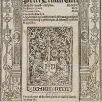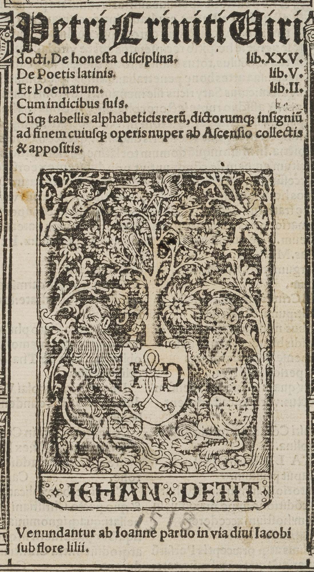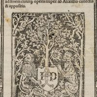 - Beschreibung: Späterer Abzug des 18. oder 19. Jahrhunderts. Mit menschenähnlichen Raubkatzen unter einem Baum ein Wappen mit den Initialien IP haltend. Von einem Rankenband aus Fabelwesen und Ornamenten gerahmt. Rückseitig mit dem Text des Buches