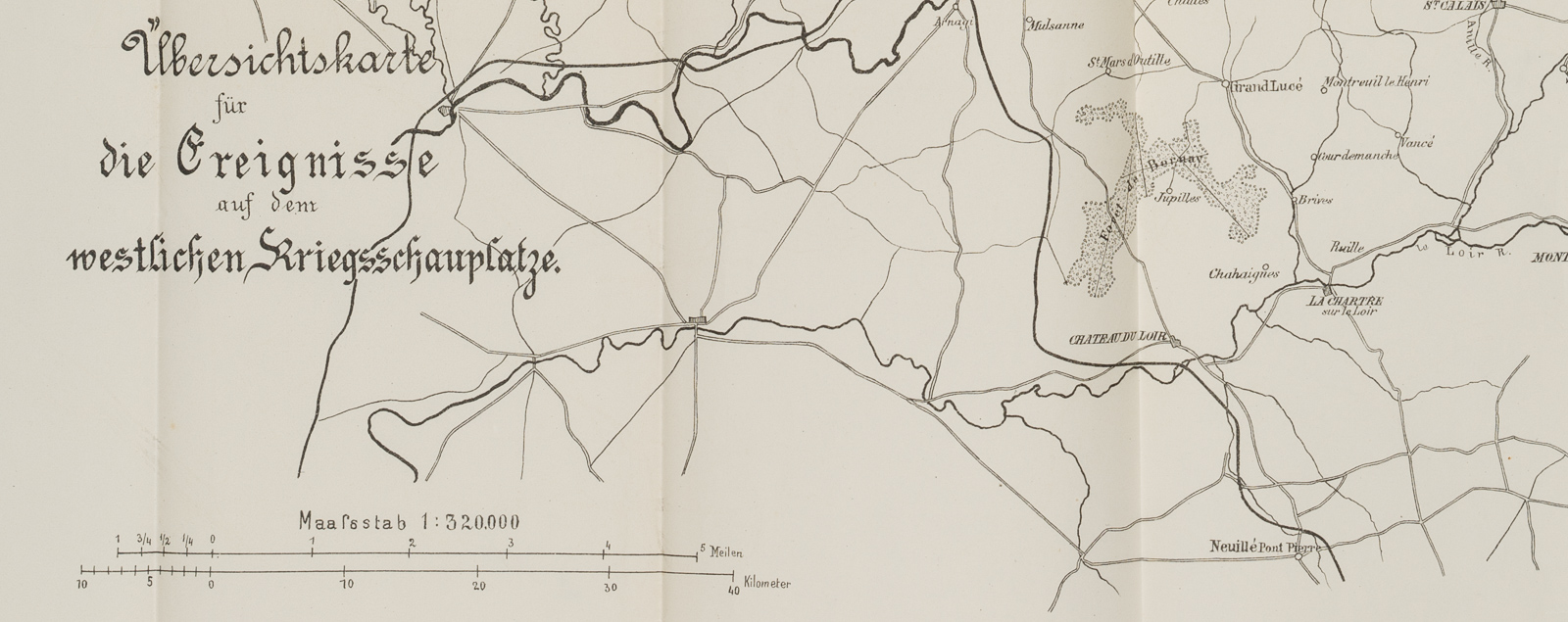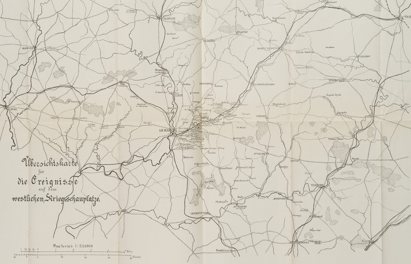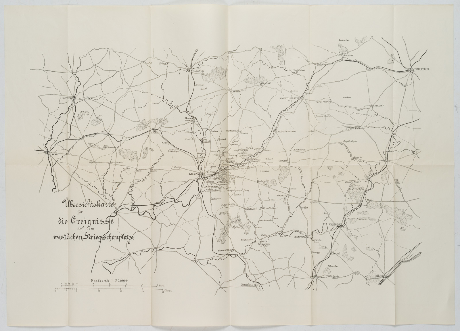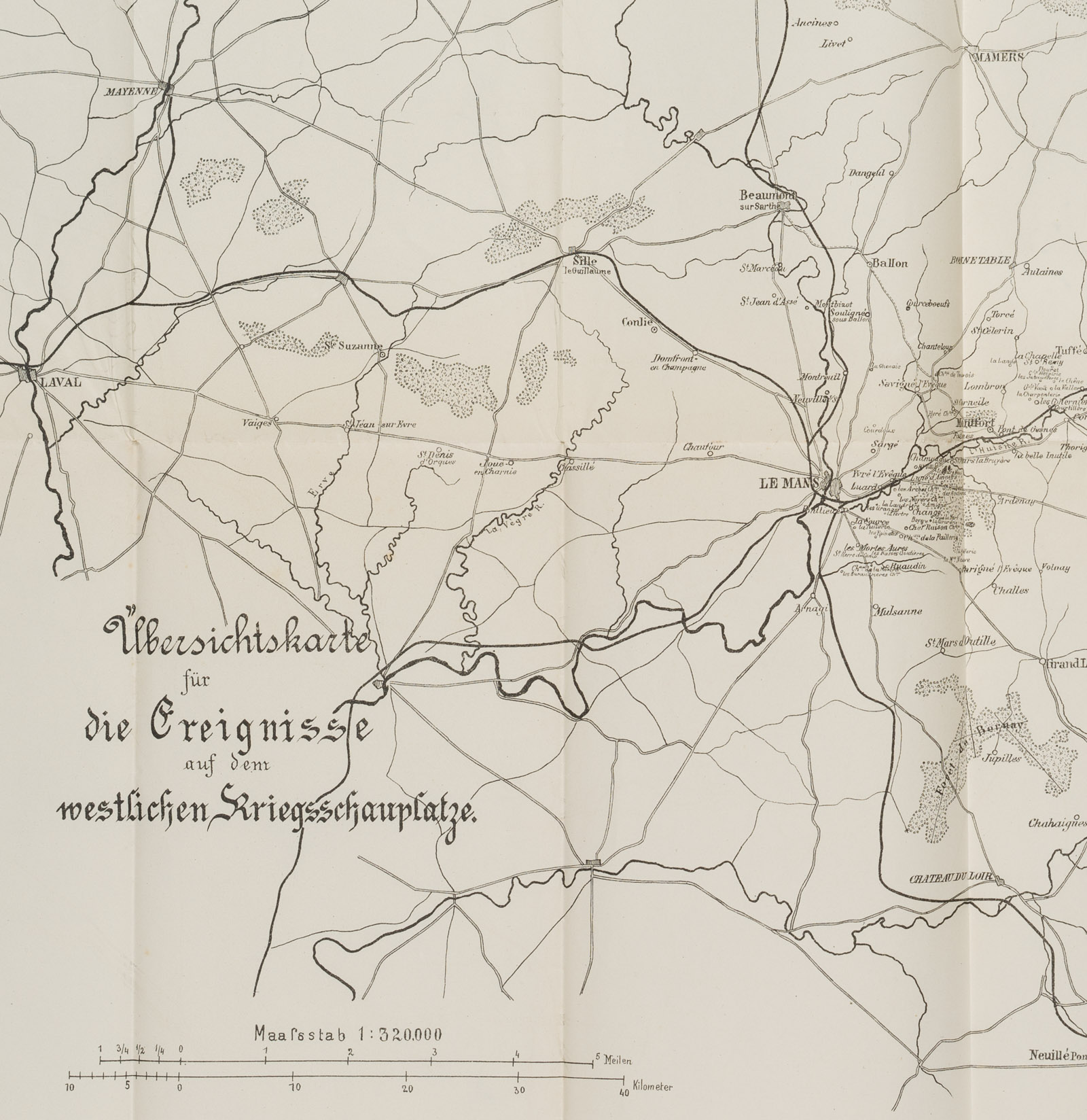 Unbekannt (19. Jahrhundert), Übersichtskarte für die Ereignisse auf dem westlichen Kriegsschauplatze, Nordwestliches Frankreich. Le Mans, Vendome, Chartres, 19. Jahrhundert, Lithographie