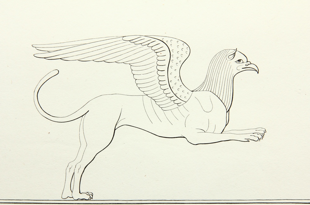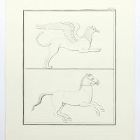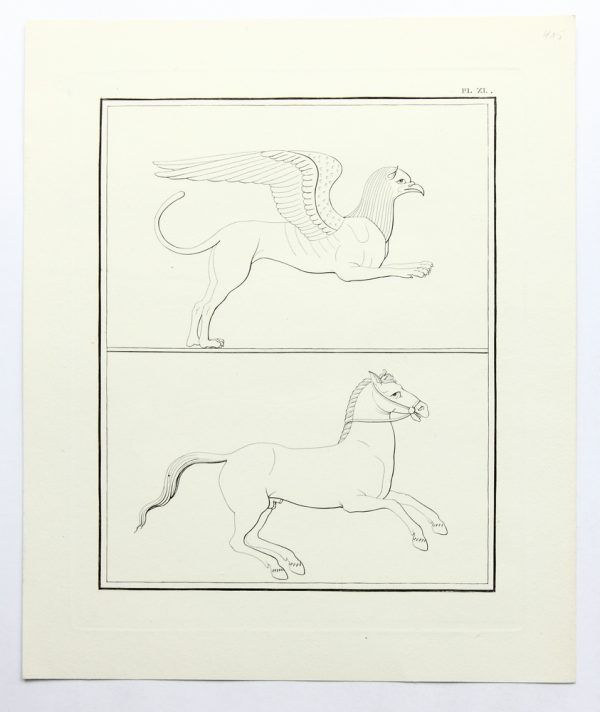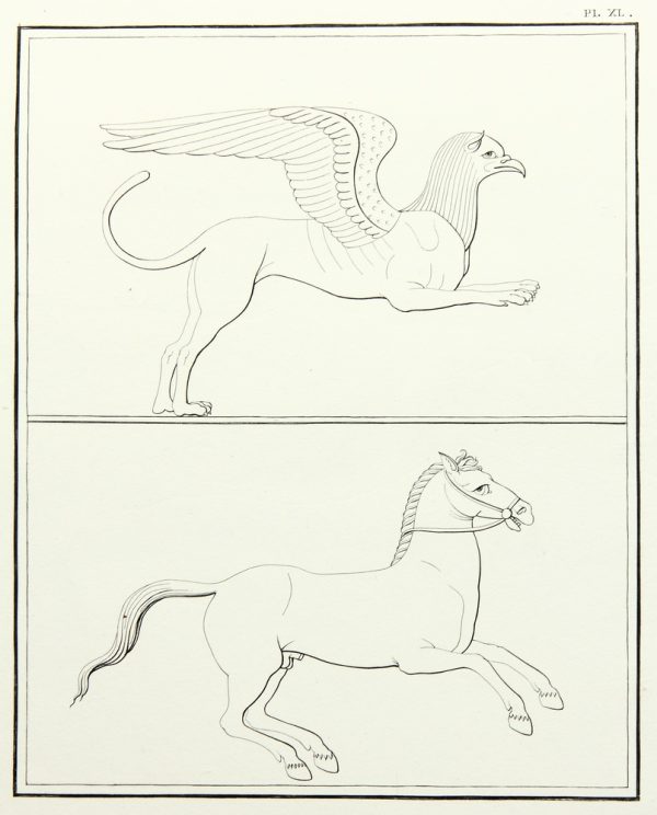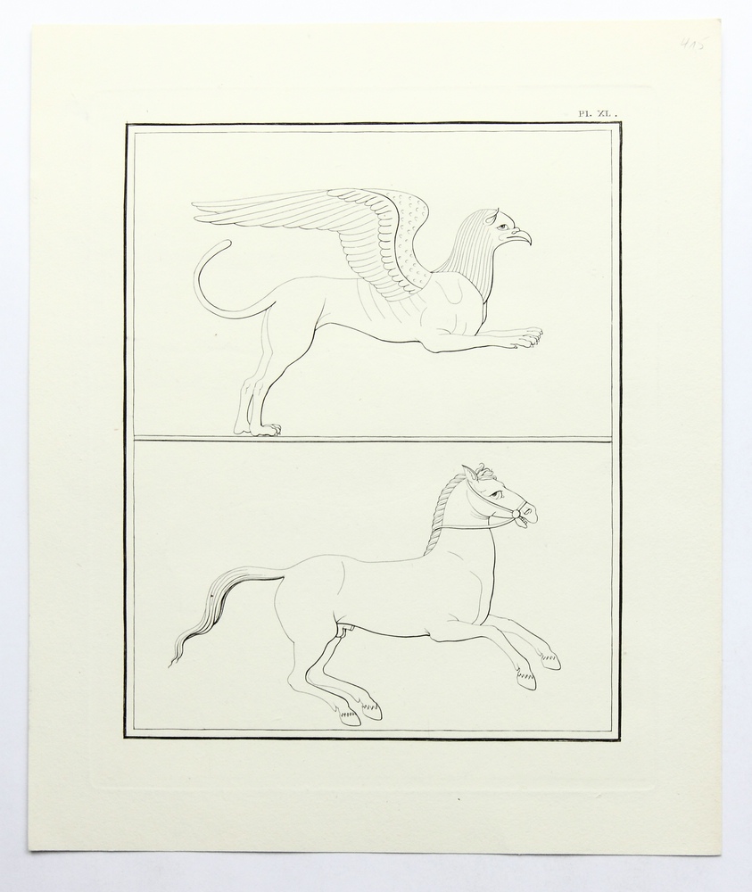 - Beschreibung: Ganzfigurige Seitenansicht zweier Tierfiguren, die vermutlich nach einem antiken oder antikisierenden Relief griechischer oder römischer Provenienz gezeichnet sind. Oberhalb der Darstellung in der Druckplatte nummeriert mit: „Pl. XL.“.