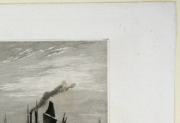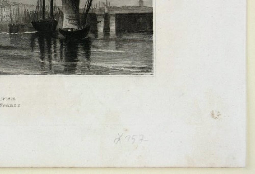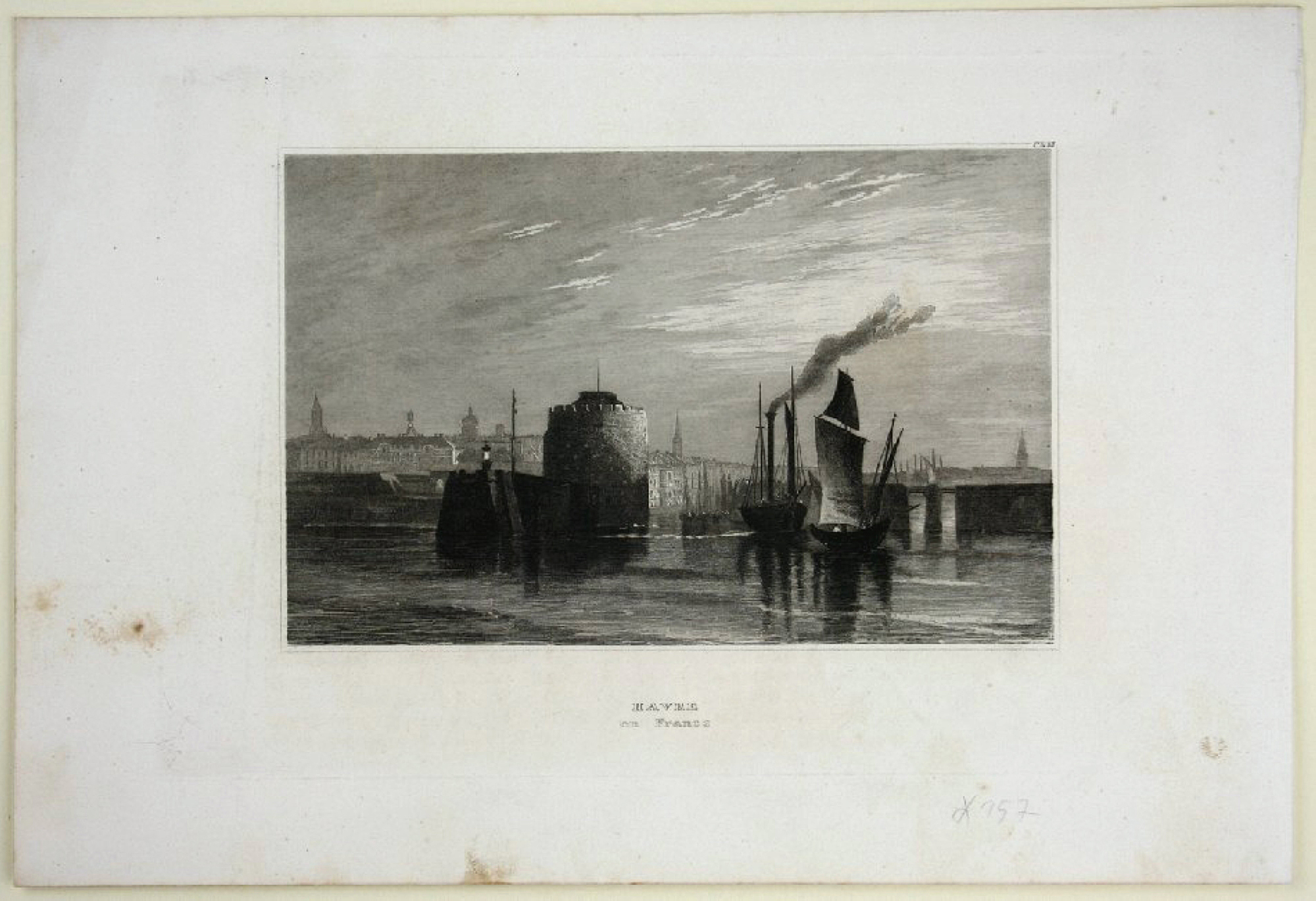 - Description: Unknown artist, Le Havre, steel engraving, c. 1850. Description: Steel engraving by an unknown artist, inscribed lower centre: “Havre en France”, inscribed upper left: “CLII”. Atmospheric view of Le Havre from the water. A mighty round tower marks the entrance to the harbour, a steamship has just left the harbour, leaving a long cloud of steam in the brightly lit sky. The silhouette of the city stands out delicately in the background.