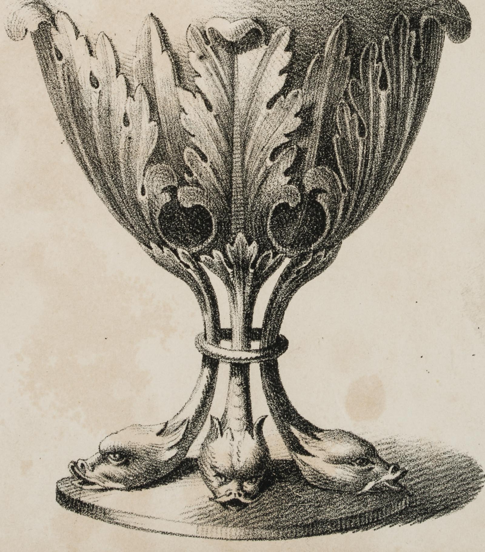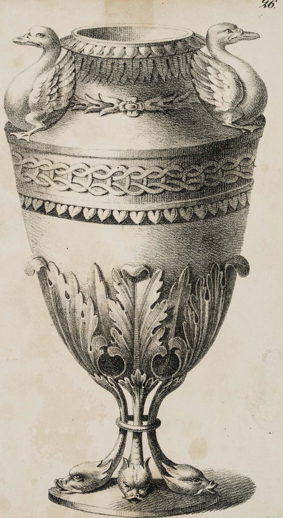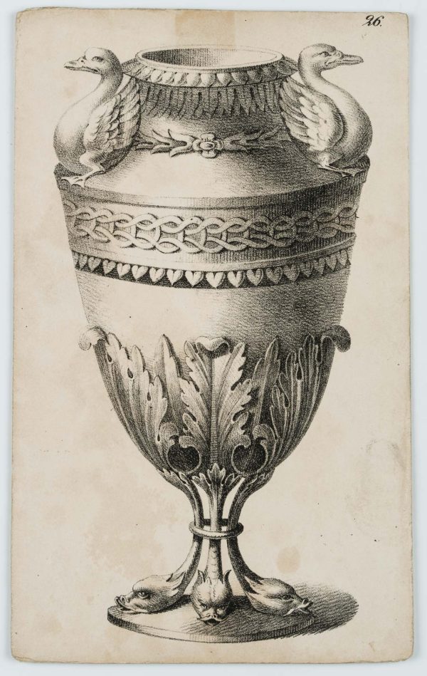 Depiction of a vessel with rich decoration. Two flanking swans are attached to the neck. At the bottom the vessel is surrounded by a wreath of standing, stylised acanthus leaves. The supporting feet are formed by three dragon heads. - Date: 19th century