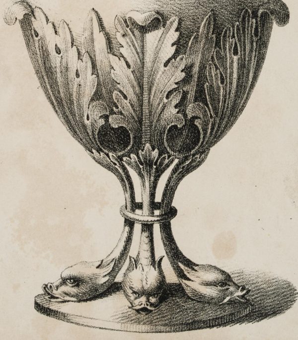 Unbekannt (19. Jahrhundert), Gefäß „Akanthus“ mit reicher Verzierung, Entwurf, Vase, Blumenvase, Schwan, 19. Jahrhundert, Lithographie