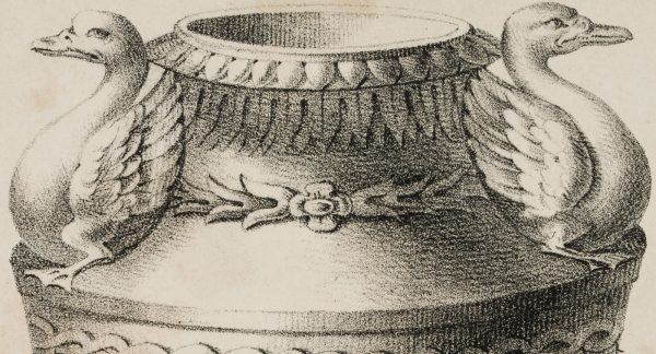 Darstellung eines Gefäßes mit reicher Verzierung. Am Halse sind zwei flankierende Schwäne angebracht. Unten ist das Gefäß mit einem Kranz stehender, stilisierter Akanthusblätter umgeben. Die Tragefüße bilden drei Drachenköpfe. - Datierung: 19. Jahrhundert
