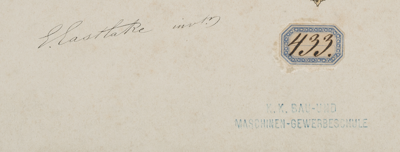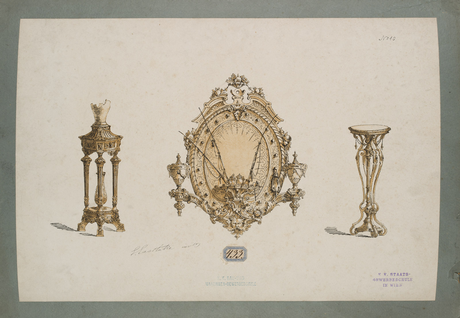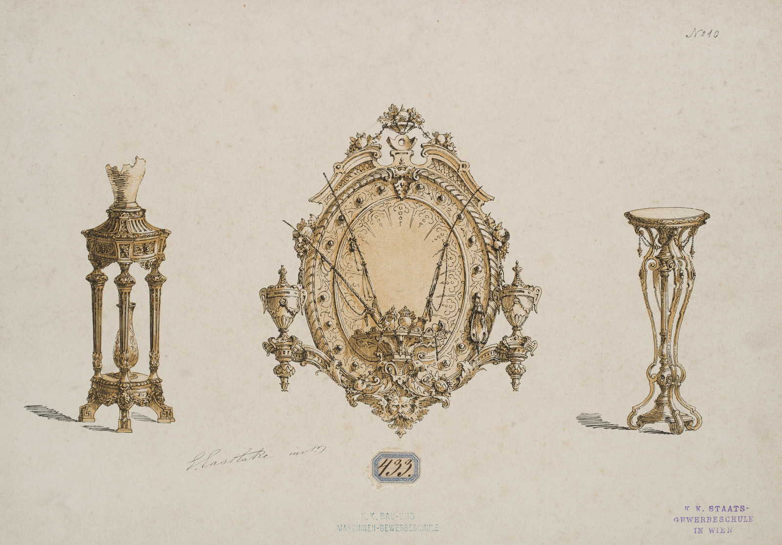 - Inscription: Signed lower left “Eastlake(?), invt.”, stamp lower centre “K.K.. Bau-und Maschinen-Gewerbeschule”, stamp on the right: “K.K. Staats-Gewerbeschule in Wien”. Label at lower centre: “433.”; numbered at upper right: No. 10.