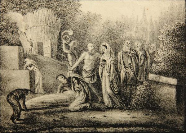 - Description: View of a group of people in full-figure representation at the Hindu act of widow cremation or sati. Two bearers lift the wrapped body of a deceased while a priest escorts the widowed woman to a funeral pyre.