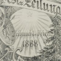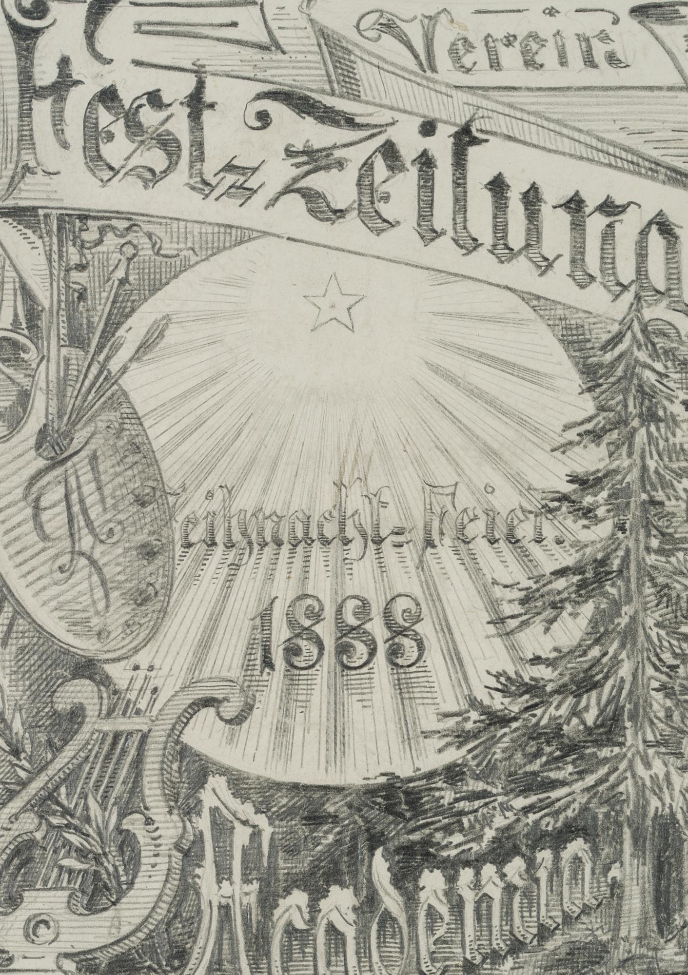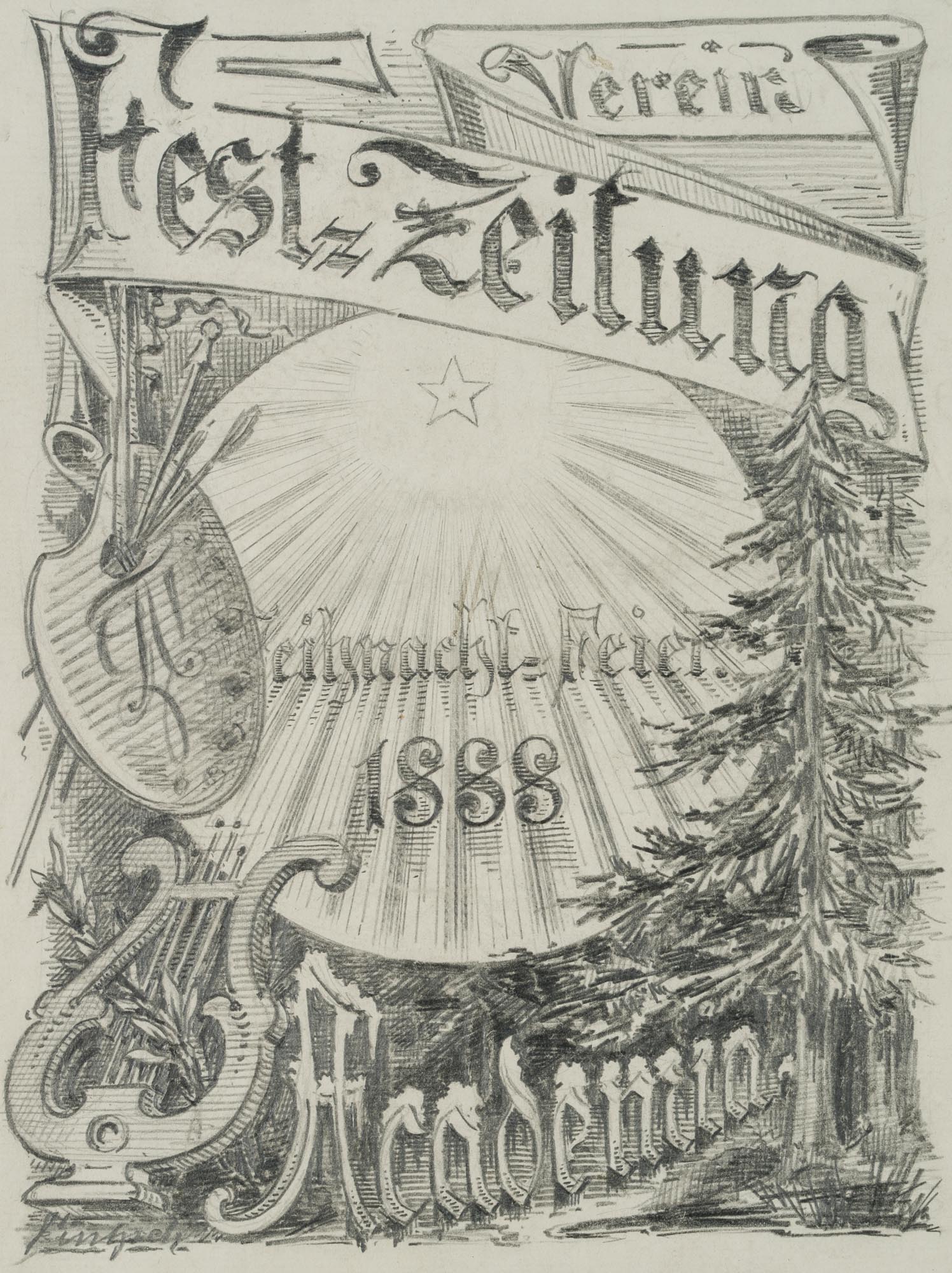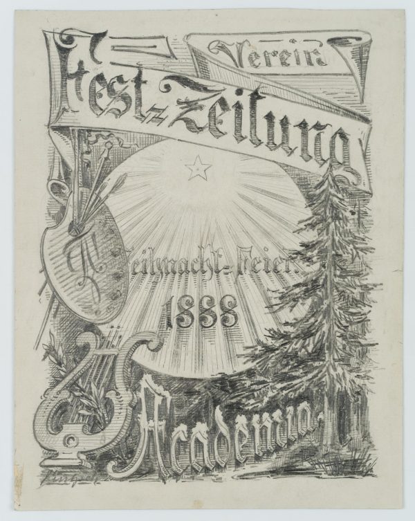 - Beschreibung: Entwurf zum Plakat der Vereinsfest-Zeitung zur Weihnachtsfeier 1888 von der ACADEMIA mit Tannenbaum, Leier und Malermischpalette mit Pinseln.