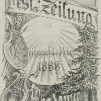 - Description: Design for the poster of the club festival newspaper for the Christmas party 1888 by the ACADEMIA with fir tree, lyre and painter’s palette with brushes.