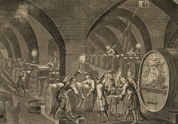 - Description: View into the vault of a wine cellar, which is lit with candles in holders on the pillars. Between the numerous wine barrels, individual figures can be seen at work next to and on the wooden barrels. In the foreground, a group of smartly dressed gentlemen and ladies have gathered for a tasting. A gentleman is offering a tray and a goblet, while the others are engaged in conversation in front of a barrel with a coat of arms.
