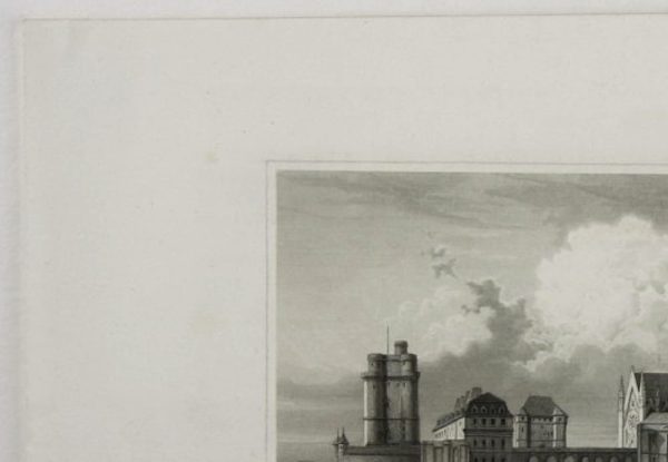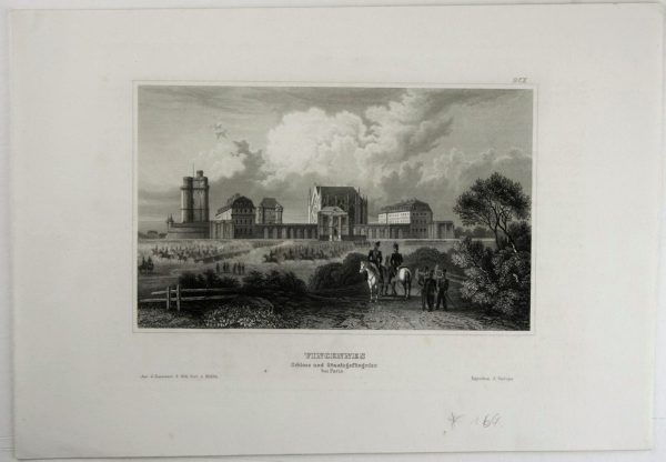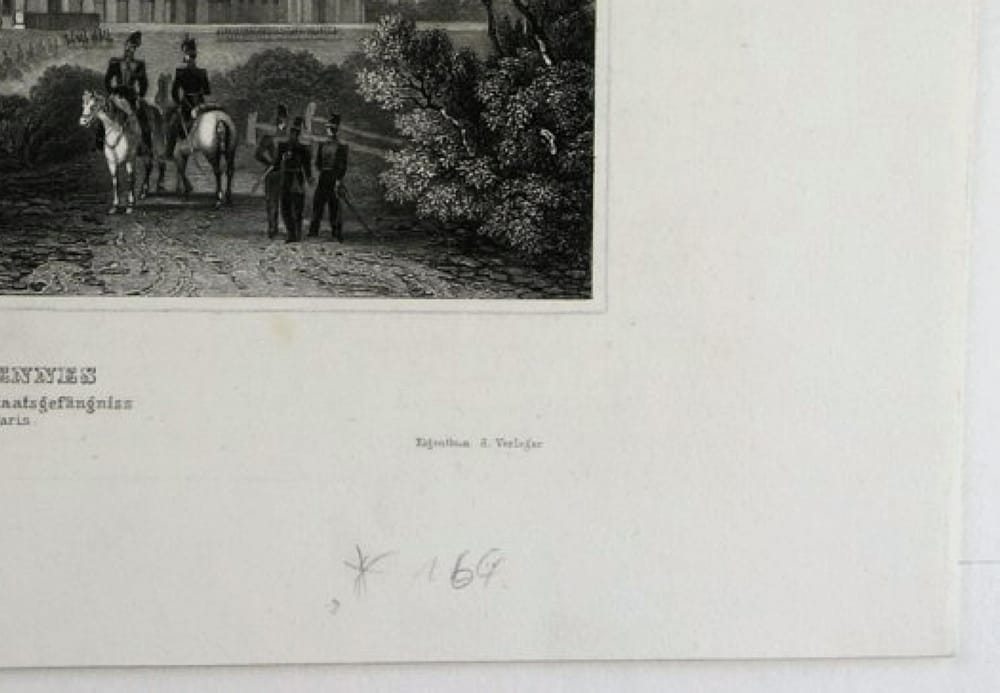 - Description: Steel engraving by an anonymous artist, inscribed: “DCX Vincennes Schloss und Staatsgefängniss bei Paris Aus d. Kunstanst. d. Bibl. Inst. in Hildbh. Property of the publisher”. The silhouette of the mighty buildings, including the chapel and the donjon, stands out impressively against a cloudy sky. On the open space in front of the castle a military parade is taking place, in the foreground some soldiers on horseback and on foot.