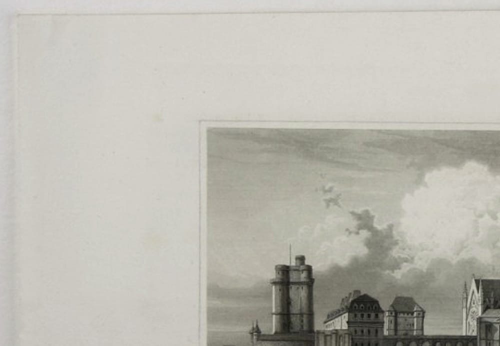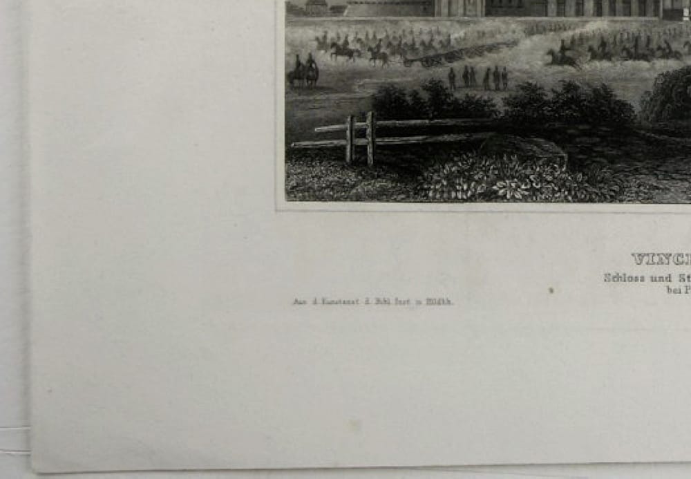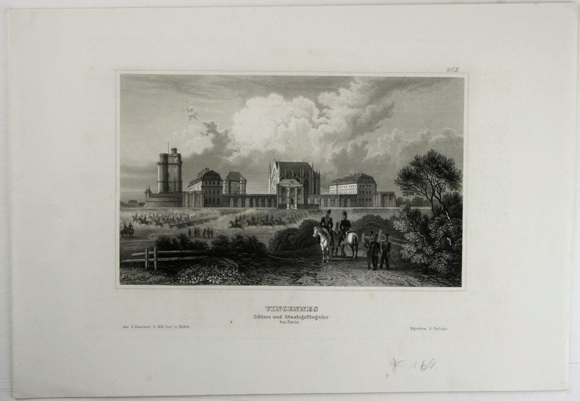 - Beschreibung: Stahlstich eines anonymen Künstlers, bezeichnet: “DCX Vincennes Schloss und Staatsgefängniss bei Paris Aus d. Kunstanst. d. Bibl. Inst. in Hildbh. Eigenthum d. Verleger”. Eindruckvoll hebt sich die Silhouette der mächtigen Gebäude, darunter die Kapelle und der Donjon, vor wolkigem Himmel ab. Auf der Freifläche vor dem Schloss findet eine Militärparade statt, im Vordergrund einige Soldaten zu Pferde und zu Fuss.