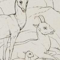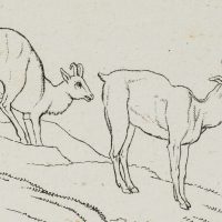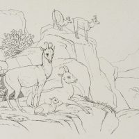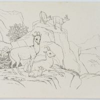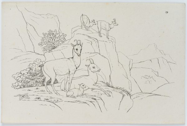 - Bezeichnung: Oben rechts nummeriert: “29”. Die Zeichenvorlage für Künstler aus dem frühen 19. Jahrhundert zeigt eine alpine Landschaft mit Gämsen auf einem Felsvorsprung.
