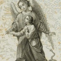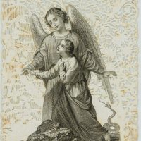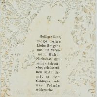 - Description: Elaborately designed votive card with embossed and punched vine work. In the centre the depiction of an angel leading another figure by the hand. Below the words “Fix your eyes on the sign of salvation.” Votive cards or votive pictures, not infrequently artistically designed, are votive offerings and thus objects that are publicly offered on the basis of a vow or betrothal as a thank-you gift for salvation from distress, danger, illness and the like. The small-format votive cards usually contain a small devotional picture and are decorated with elaborate ornaments.