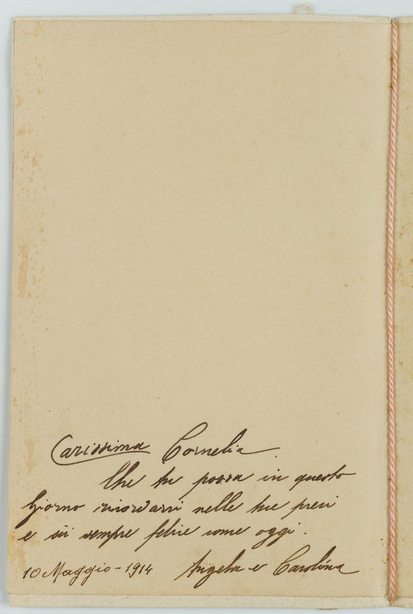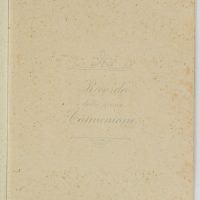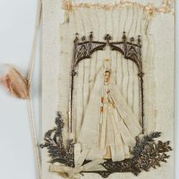 - Description: Elaborately designed votive card for the occasion of Holy Communion. On the front the depiction of a girl with communion dress and baptismal candle/communion candle under a canopy with textile robe. Floral vine work surrounds the saint. Inside the card a handwritten greeting and the date, 10 March 1914. Votive cards or votive pictures, not infrequently artistically designed t, are votive offerings and thus objects that are publicly offered on the basis of a vow or betrothal as a thank-you gift for salvation from hardship, danger, illness, etc. The small-format votive cards are made of wood. The small-format votive cards usually contain a small devotional picture and are designed with elaborate ornamentation. For further classification, see also Adolf Spamer: Das kleine Andachstbild vom XIV. bis zum XX. Jahrhundert.