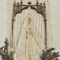 - Zustand: Guter Zustand. Das Zierwerk und die Textilarbeit sind stellenweise fragil oder leicht beschädigt. Blasse Verfärbungen und vereinzelt kleine Stockflecken.