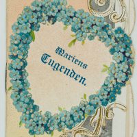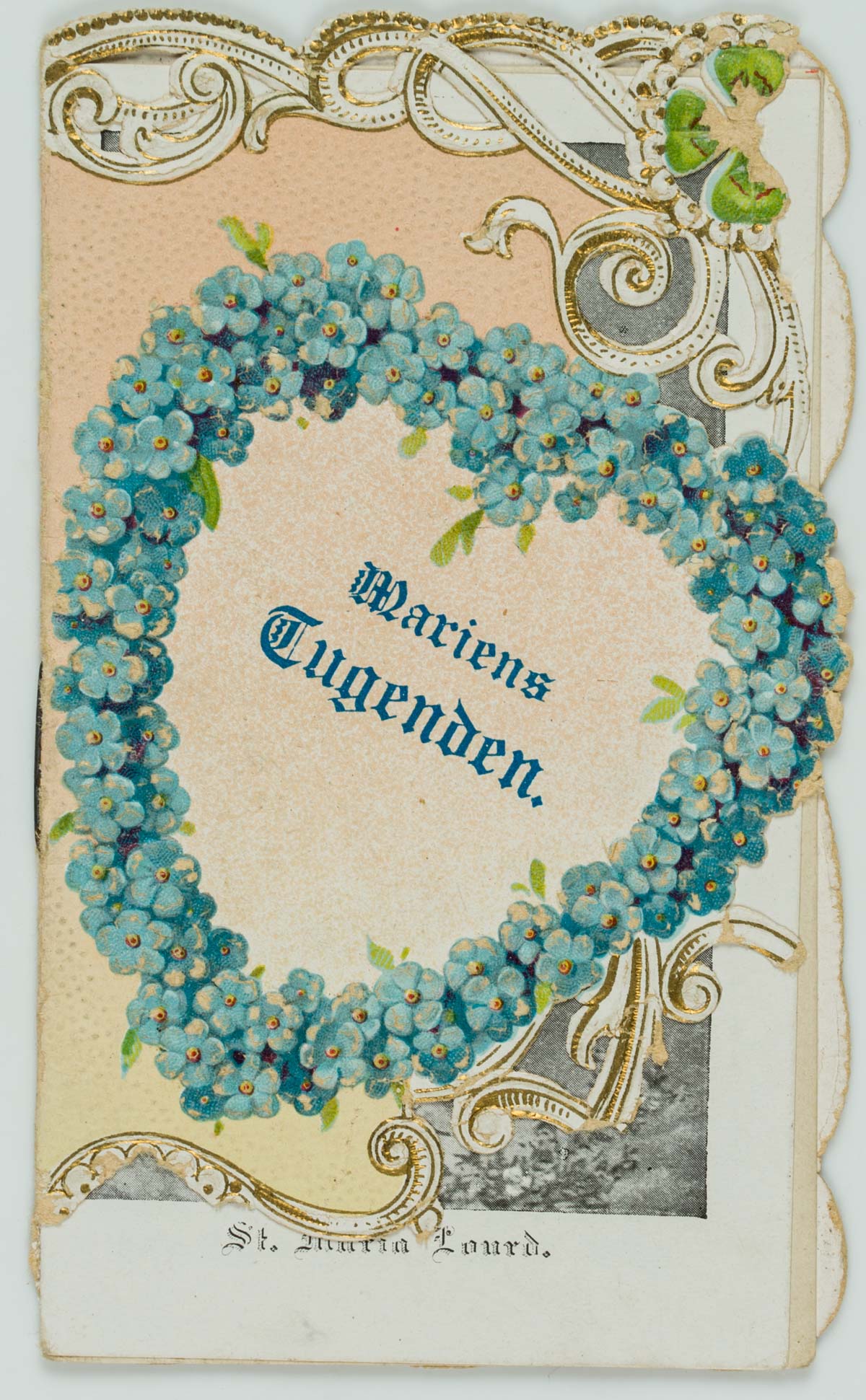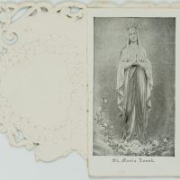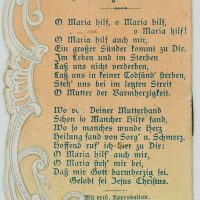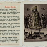 - Description: Elaborately designed votive card with embossed and punched frame. On the front a wreath of flowers in the shape of a heart, within which can be read “Mary’s virtues”. The small card contains depictions of Mary, next to it excerpts from Mary’s life. On the reverse a “Prayer to Mary”. Votive cards or votive pictures, not infrequently artistically designed, are votive offerings and thus objects that are publicly offered on the basis of a vow or betrothal as a thank-you gift for salvation from hardship, danger, illness, etc. The small-format votive cards usually contain a small devotional picture and are designed with elaborate ornamentation. For further classification, see also Adolf Spamer: Das kleine Andachstbild vom XIV. bis zum XX. Jahrhundert.