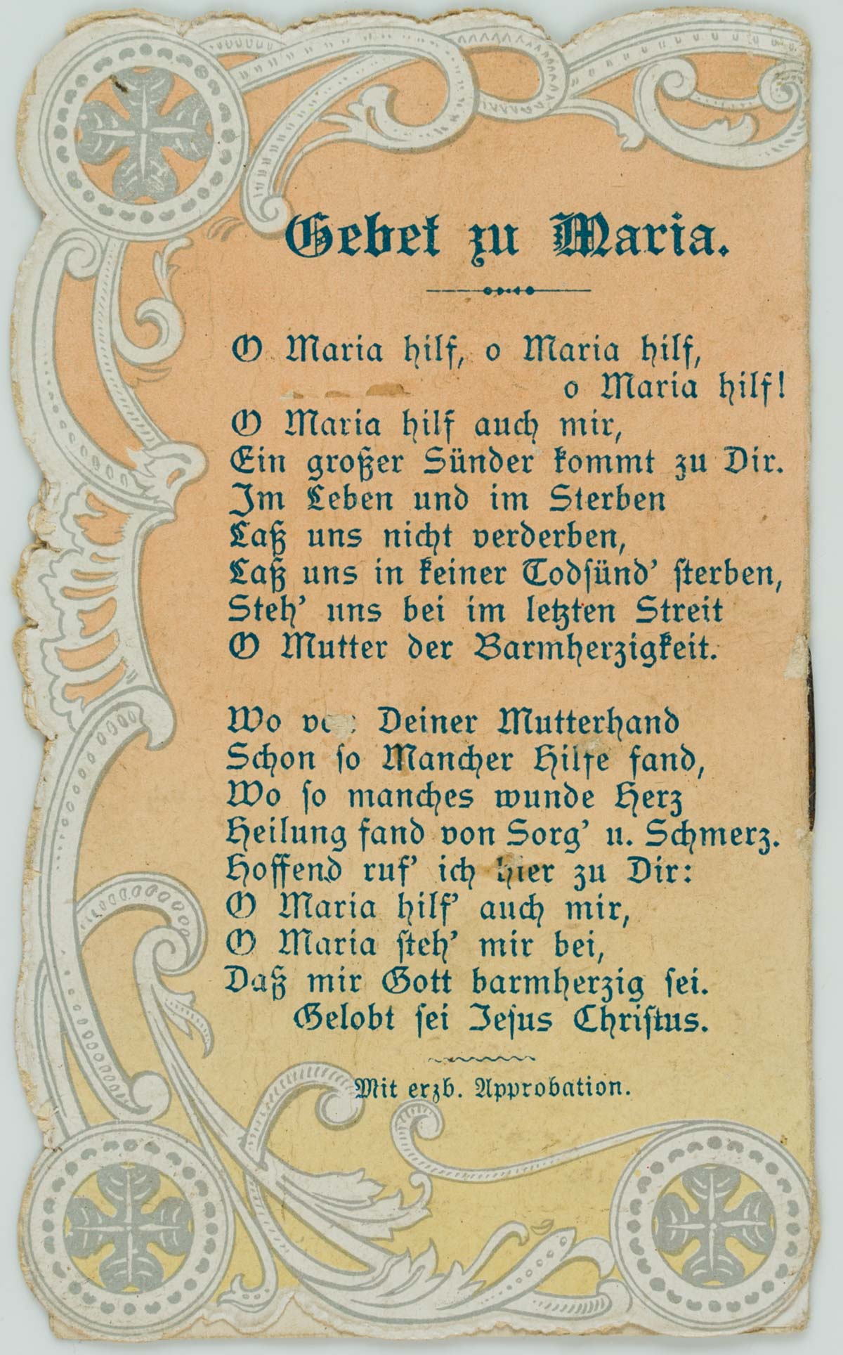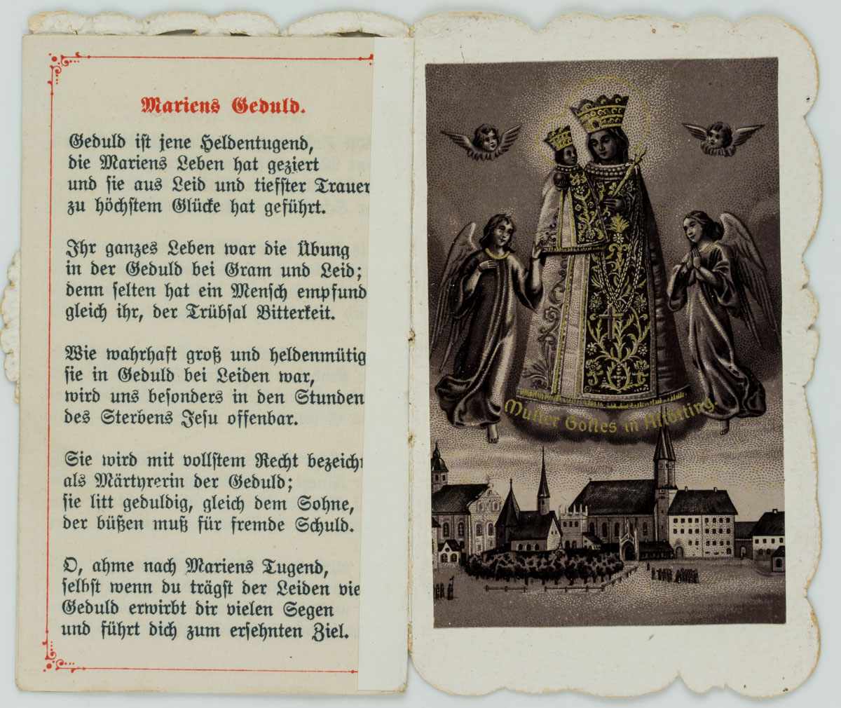 - Beschreibung: Aufwändig gestaltete Votivkarte mit geprägtem und gestanzten Rahmen. Auf der Vorderseite ein Blumenkranz in Herzform, darin zu lesen “Mariens Tugenden”. Die kleine Karte enthält Darstellungen Mariens, daneben Auszüge aus dem Leben Marias. Rückseitig ein “Gebet zu Maria”. Votivkarten oder Votivbilder, nicht selten kunstfertig gestaltete t, sind Votivgaben und damit Gegenstände, die aufgrund eines Gelübdes bzw. einer Verlobung als Dankesgabe für Errettung aus Not, Gefahr, von Krankheit u.a. öffentlich dargebracht werden. Die kleinformatigen Votivkarten enthalten in den meisten Fällen ein kleines Andachtsbild und sind mit aufwändigem Zierwerk gestaltete t.Zur weiteren Einordnung siehe auch Adolf Spamer: Das kleine Andachstbild vom XIV. bis zum XX. Jahrhundert.