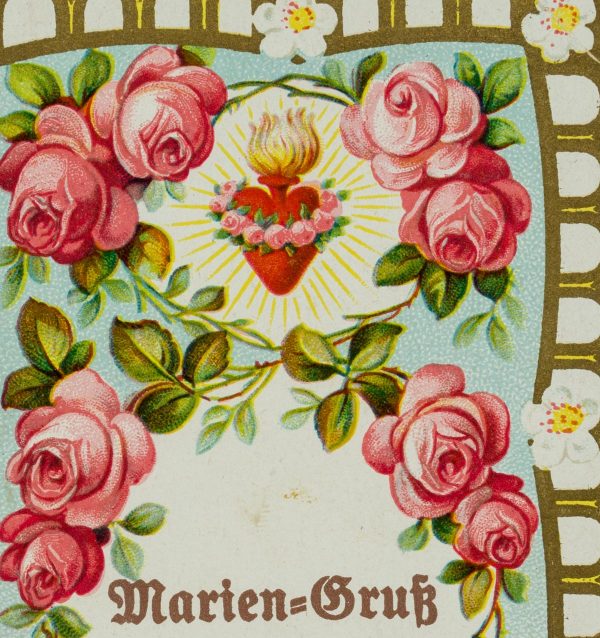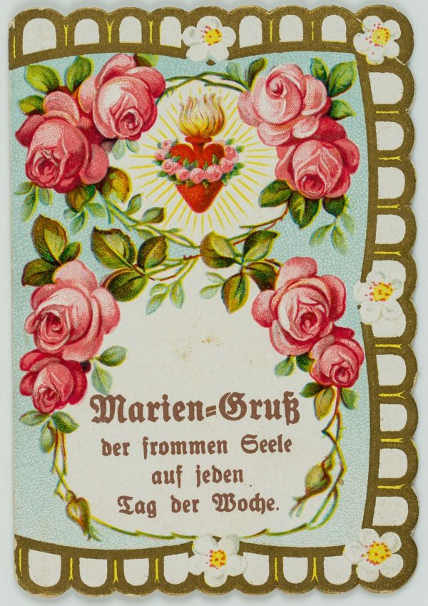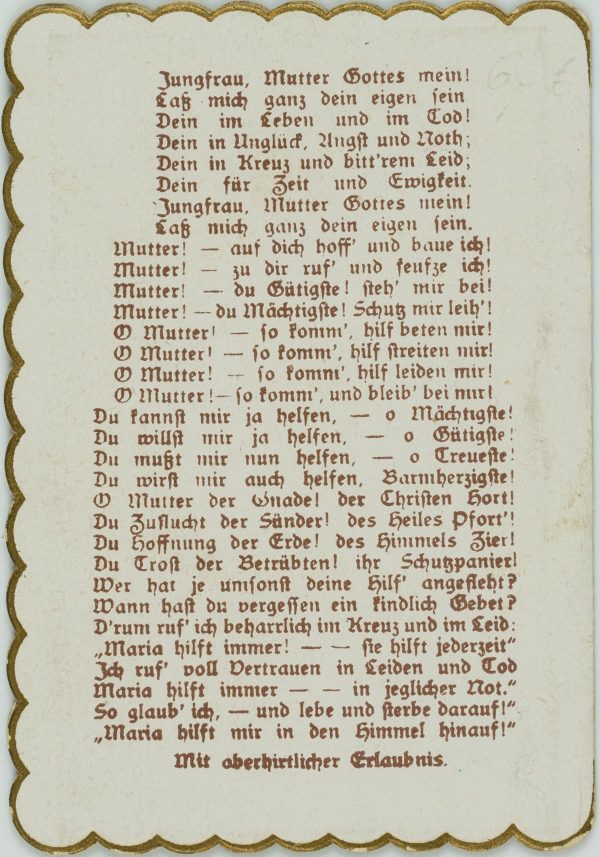 - Beschreibung: Sorgsam gestaltete Votivkarte mit floralen Ornamenten auf der Vorderseite und Zierwerk. Im Inneren eine Darstellung Mariens mit dem Jesuskind. Rückseitig ein Gebet zu Ehren Mariens. Votivkarten oder Votivbilder, nicht selten kunstfertig gestaltete t, sind Votivgaben und damit Gegenstände, die aufgrund eines Gelübdes bzw. einer Verlobung als Dankesgabe für Errettung aus Not, Gefahr, von Krankheit u.a. öffentlich dargebracht werden. Die kleinformatigen Votivkarten enthalten in den meisten Fällen ein kleines Andachtsbild und sind mit aufwändigem Zierwerk gestaltete t.