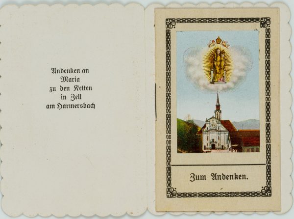 - Description: Carefully designed votive card with floral ornaments on the front and ornamental work. Inside a depiction of Mary with the infant Jesus. On the reverse a prayer in honour of Mary. Votive cards or votive pictures, not infrequently artistically designed, are votive offerings and thus objects that are publicly offered on the basis of a vow or a betrothal as a thank-you gift for salvation from distress, danger, illness, etc. The small-format votive cards are made of wood. The small-format votive cards usually contain a small devotional picture and are designed with elaborate ornamentation.