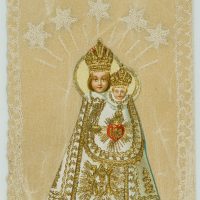 - Description: Carefully designed votive card with ornaments and decoration on the front. In the centre a depiction of two figures, possibly Mary with the infant Jesus, with a monogram on the reverse. Votive cards or votive pictures, not infrequently artistically designed, are votive offerings and thus objects that are publicly offered on the basis of a vow or a betrothal as a thank-you gift for salvation from distress, danger, illness, etc. The small-format votive cards are also known as votive cards. The small-format votive cards usually contain a small devotional picture and are decorated with elaborate ornaments.