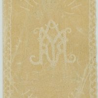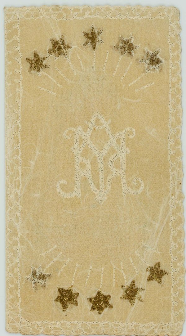 - Beschreibung: Sorgsam gestaltete Votivkarte mit Ornamenten und Zierwerk auf der Vorderseite. Im Zentrum eine Darstellung zweier Figuren, womöglich Maria mit dem Jesuskind.Rückseitig ein Monogramm. Votivkarten oder Votivbilder, nicht selten kunstfertig gestaltetet, sind Votivgaben und damit Gegenstände, die aufgrund eines Gelübdes bzw. einer Verlobung als Dankesgabe für Errettung aus Not, Gefahr, von Krankheit u.a. öffentlich dargebracht werden. Die kleinformatigen Votivkarten enthalten in den meisten Fällen ein kleines Andachtsbild und sind mit aufwändigem Zierwerk gestaltetet.