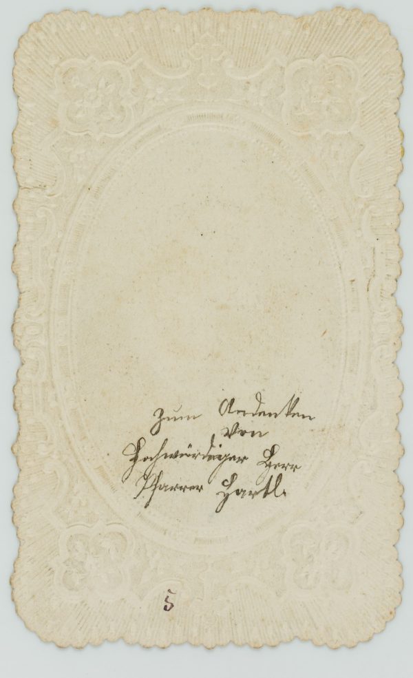 - Beschreibung: Aufwändig gestaltete Votivkarte mit feinem Prägedruck. Hinter dem Blumenbouquet eine Darstellung Mariens. In Begleitung einer weiteren weiblichen Figur trägt sie auf ihrer Brust ein flammendes Herz, welches ein Dolch durchstoßen hat, das heilige Herz Jesu. Votivkarten oder Votivbilder, nicht selten kunstfertig gestaltet, sind Votivgaben und damit Gegenstände, die aufgrund eines Gelübdes bzw. einer Verlobung als Dankesgabe für Errettung aus Not, Gefahr, von Krankheit u.a. öffentlich dargebracht werden. Die kleinformatigen Votivkarten enthalten in den meisten Fällen ein kleines Andachtsbild und sind mit aufwändigem Zierwerk gestaltet.